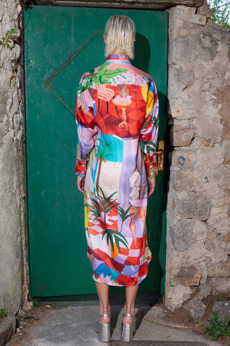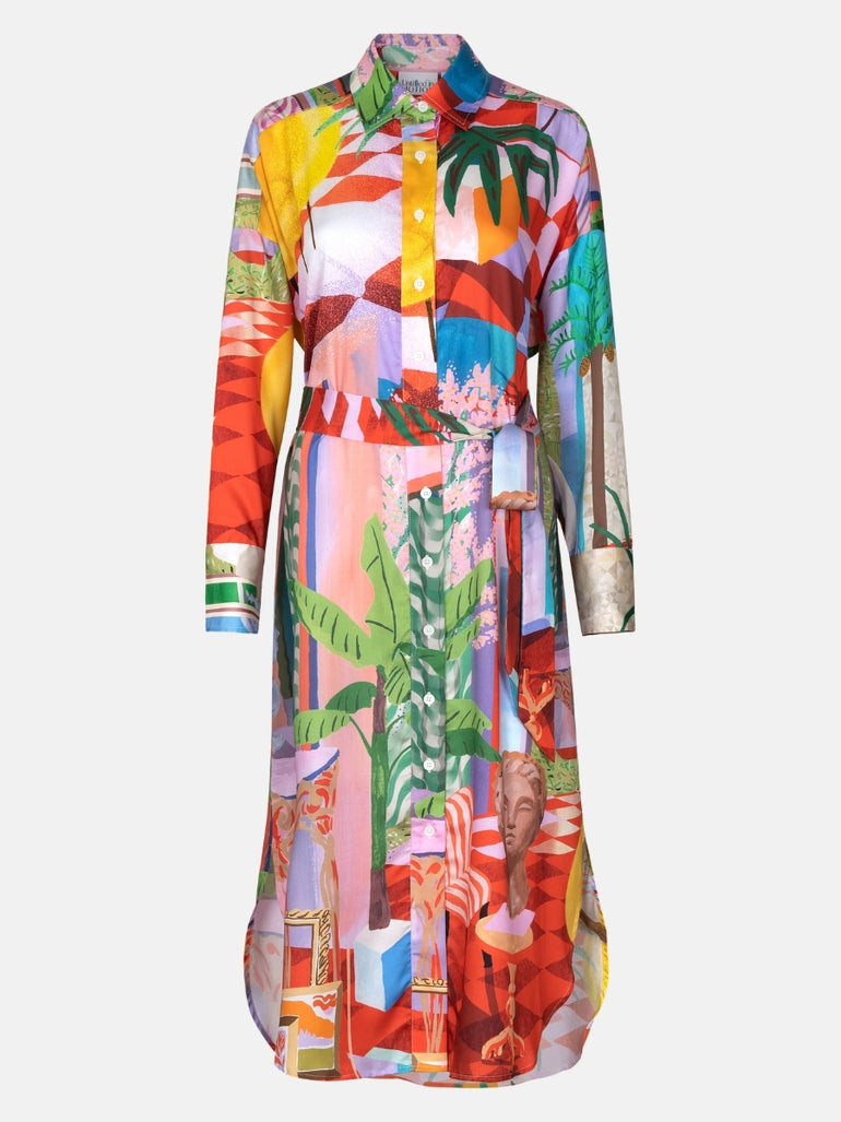 The Ona dress is a perfect easy fit midi dress crafted from certified washed TENCEL™ with silky twill finish. Featuring UIM custom hand painted artwork Novela, it's an effortless silhoutte with relaxed, slightly voluminous sleeves, a full front button closure, and removable waist tie for a flattering, adjustable option.