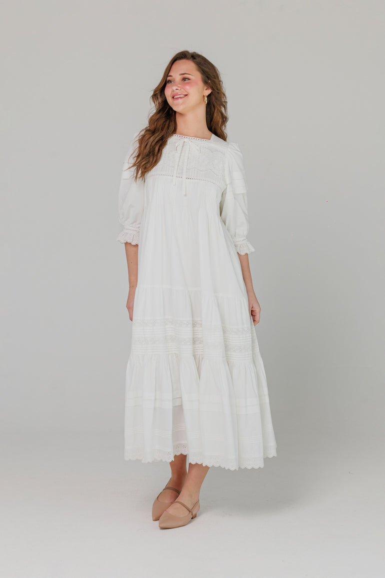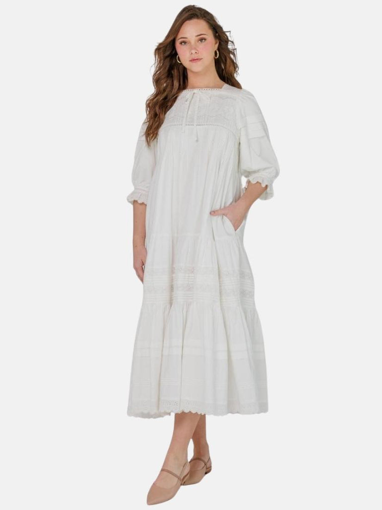 This white picnic dress is effortlessly chic, featuring delicate lace details and a flowy, lightweight fabric. Perfect for airy easy dreamy look, it creates a soft, romantic silhouette with every breeze and step. Fit is full and oversized