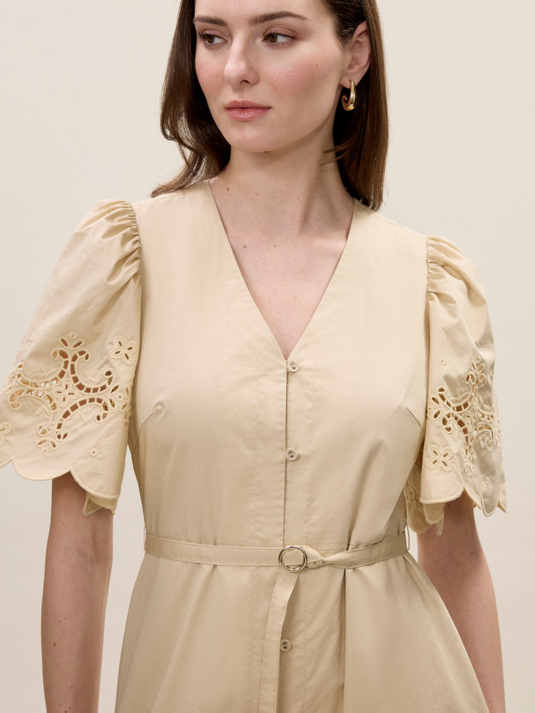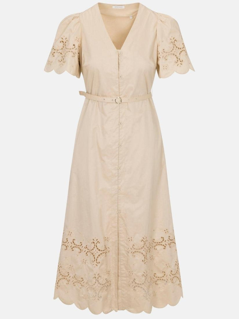 This dress elevates timeless elegance in a sophisticated latte hue, where matte cotton embroidery and intricate cutouts create a story of artisanal beauty. The midi-length design features cotton-covered buttons and pure cotton construction throughout, with each detail thoughtfully crafted to create a masterpiece of refined style.