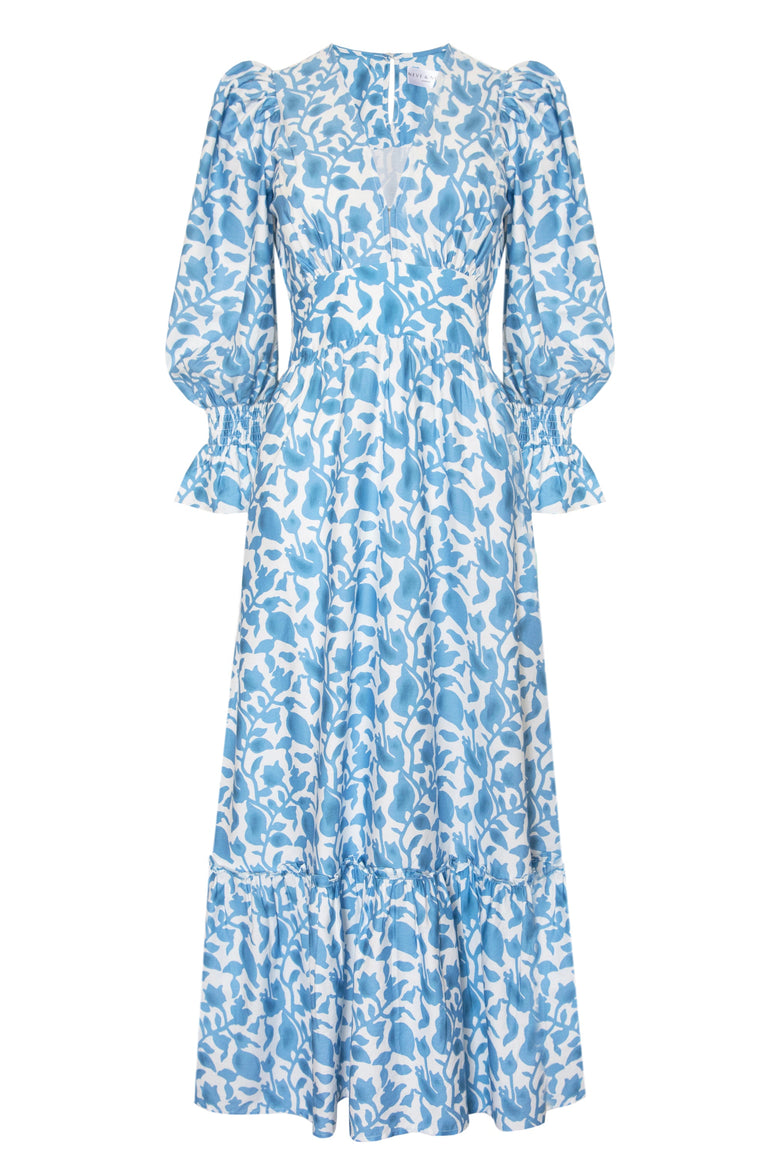 Our iconic and best selling style, the Sophia Dress is the most unique flattering shape for all sizes. Beautiful floating midi length. Sophisticated, elegant but understated. in our latest hand-printed Aquamarine colour. This print is a wardrobe staple. We have all your events covered with this beauty.