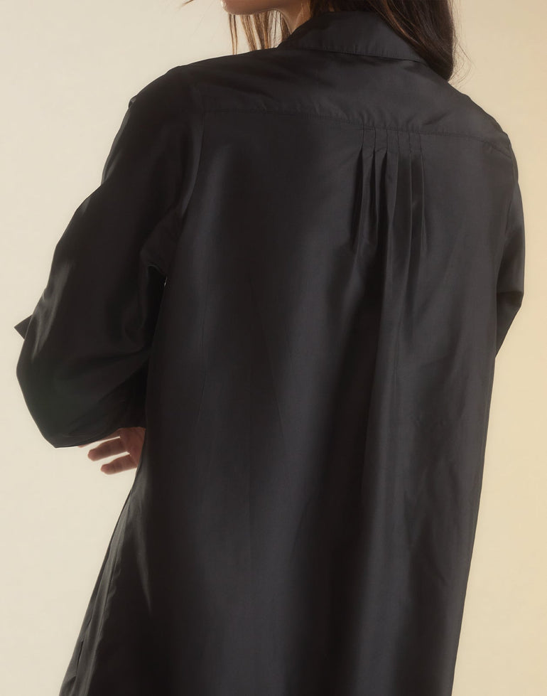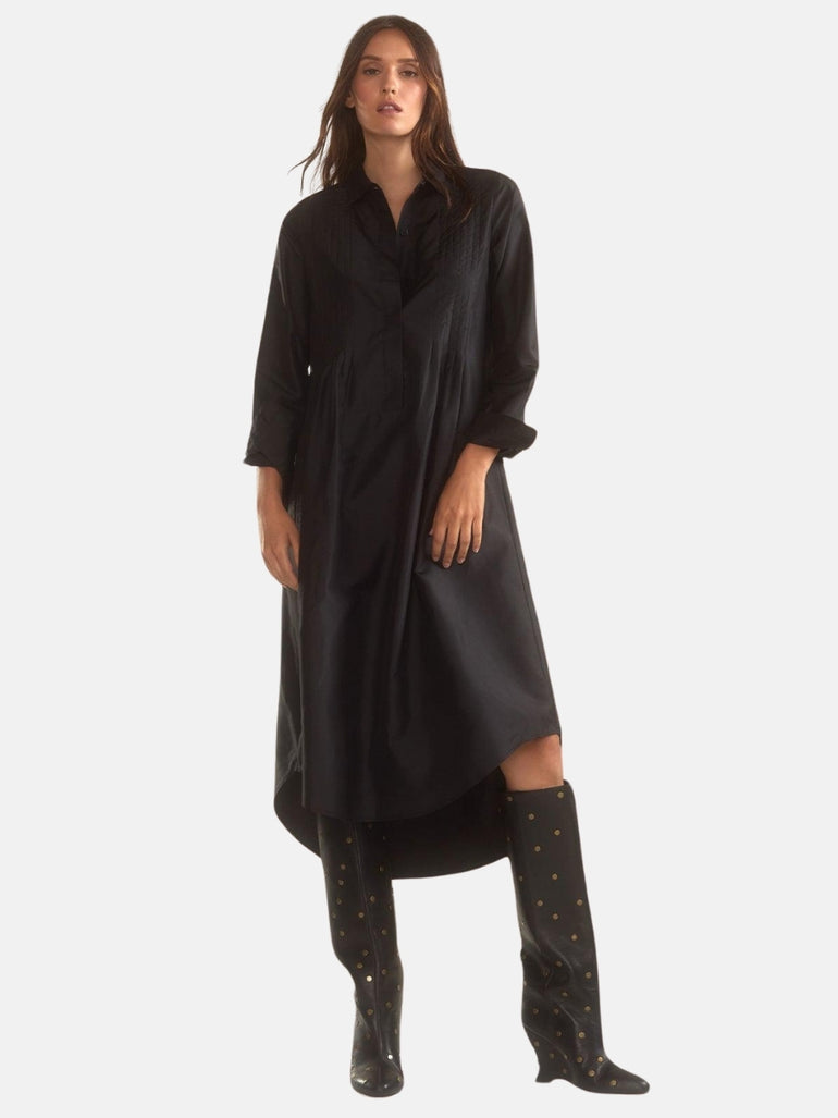 Silk taffeta pintuck black high-low shirt dress