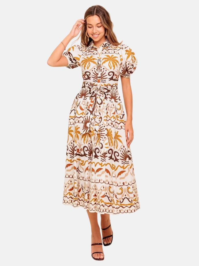 A printed woven midi dress featuring collar, short puff sleeve, button down, self sash and full skirt