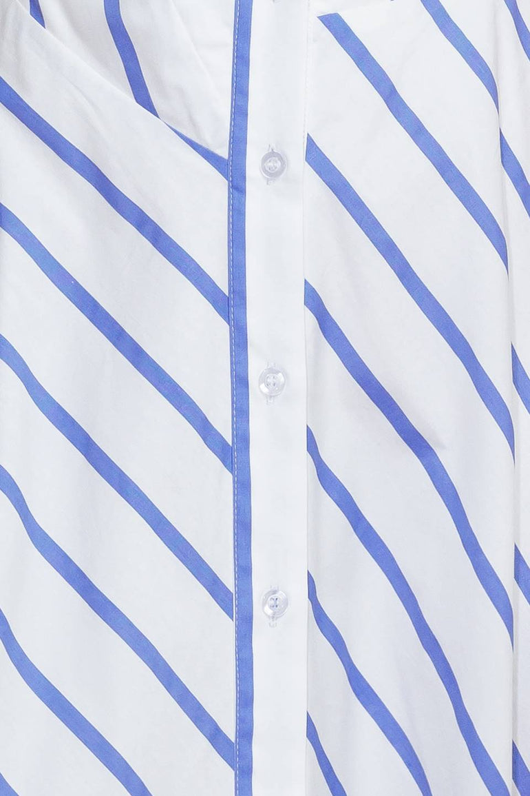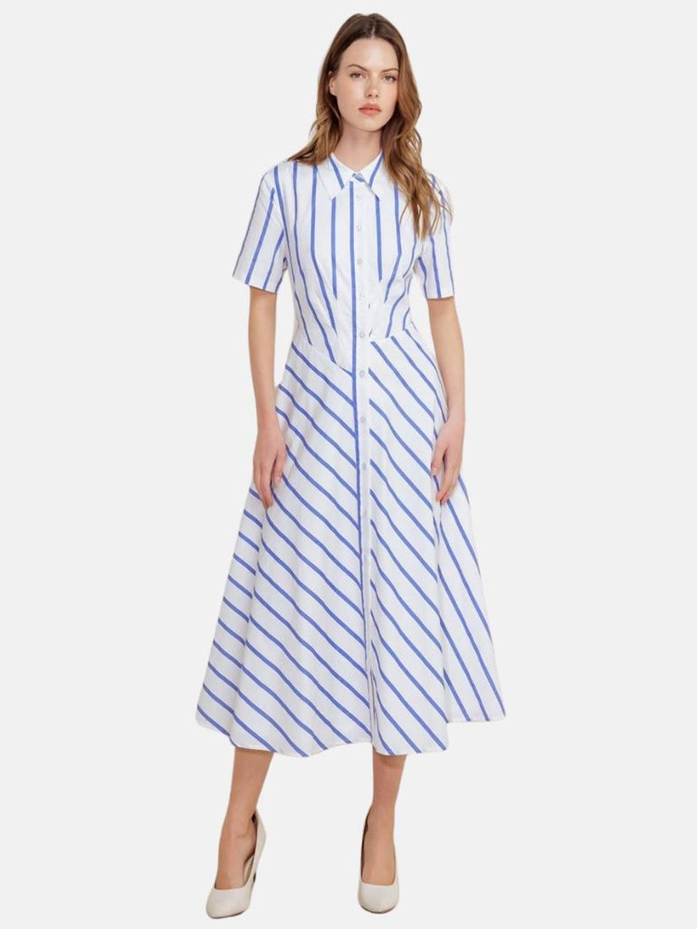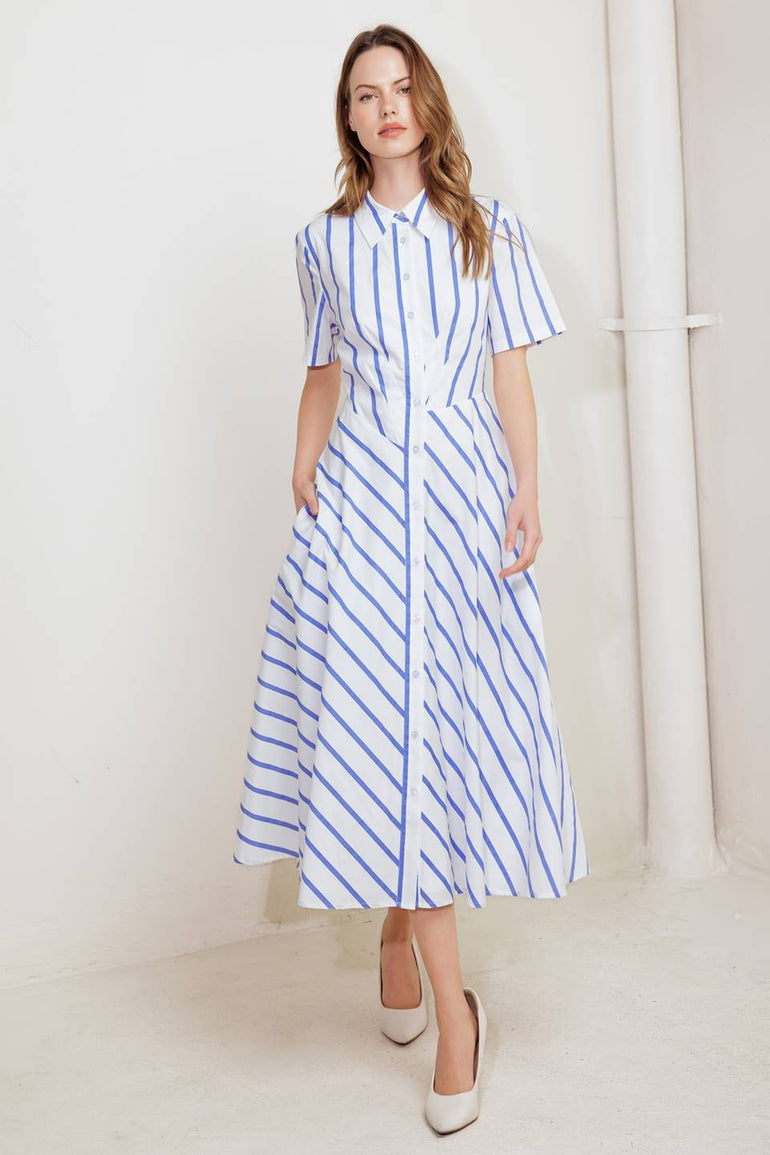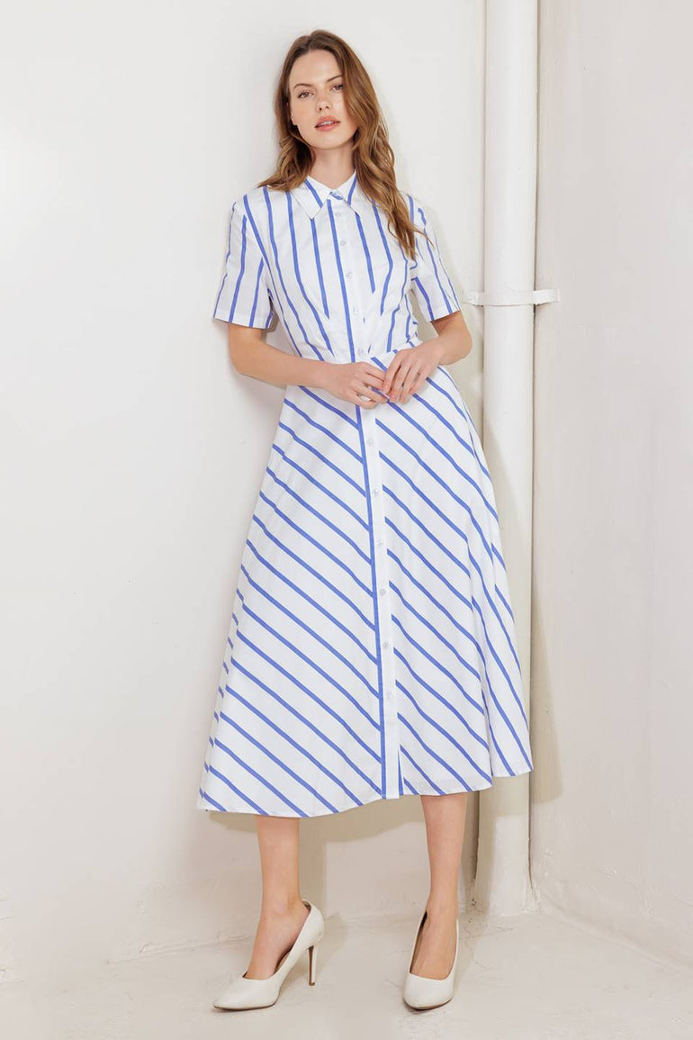 A striped woven midi dress featuring collar, short sleeve, button down and circle skirt