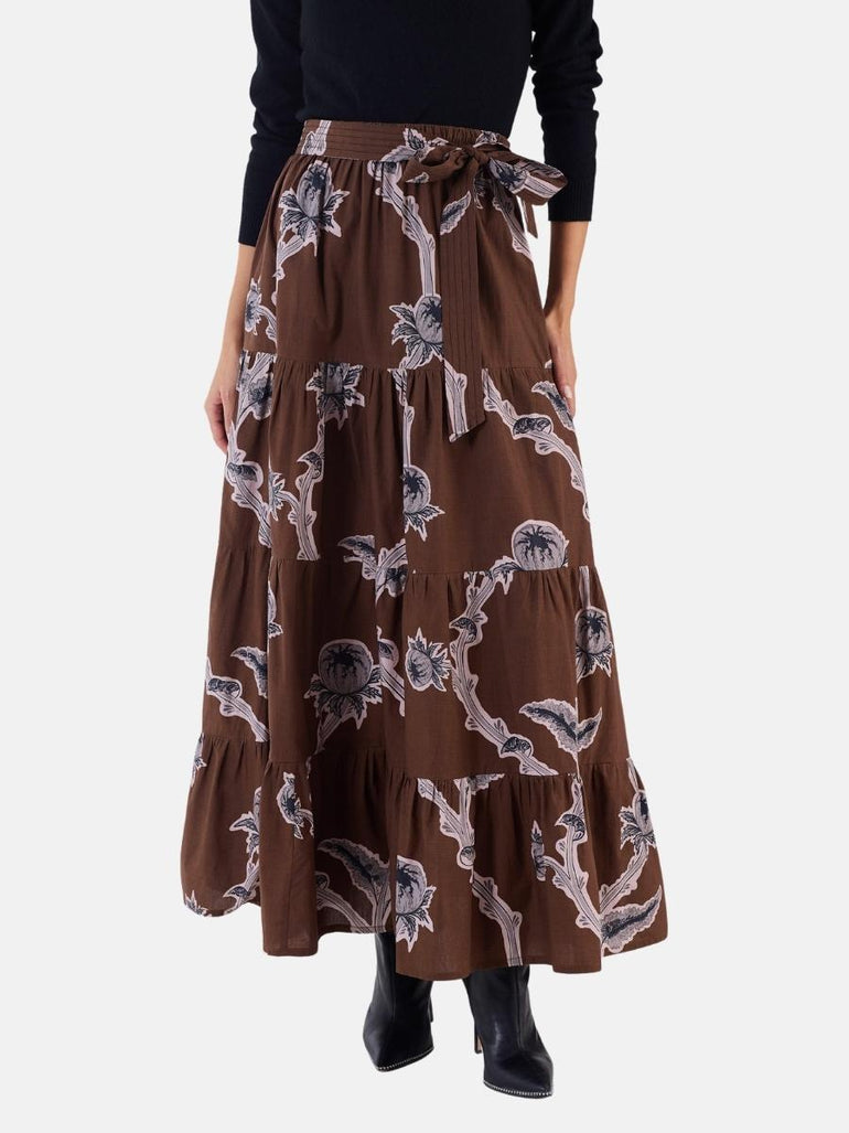 The Gia skirt is back in a new intriguing print. The elastic waist, self-tie belt, tiered A-line and hidden pockets channel elegance with ease. Pair it with a chic blouse or dress down with a white t-shirt and trainers. Gia is crafted from crisp cotton poplin, breathable and soft against the skin. This print artwork is inspired by wild forest flora, capturing soft brown and vanilla tones that evoke the earthy beauty of an untouched, seasonal landscape.