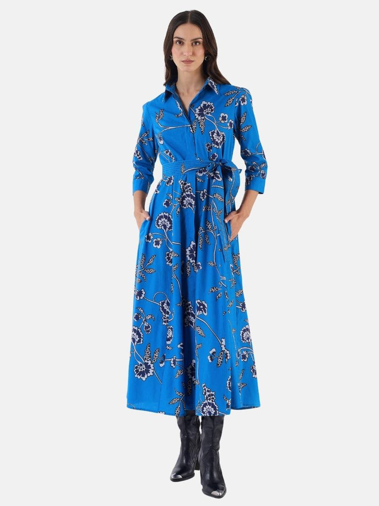 Our popular Emily is a classic shirt dress with an elegant ease and flattering, effortless silhouette. The dress buttons down at the front and features 3/4 sleeves. Accentuate the waist with the featured belt. Emily is crafted from crisp cotton poplin, breathable and soft against the skin. The print evokes childhood days by the river, collecting wildflowers to press as keepsakes. The design recalls the memory of finding those blooms preserved in an old book.