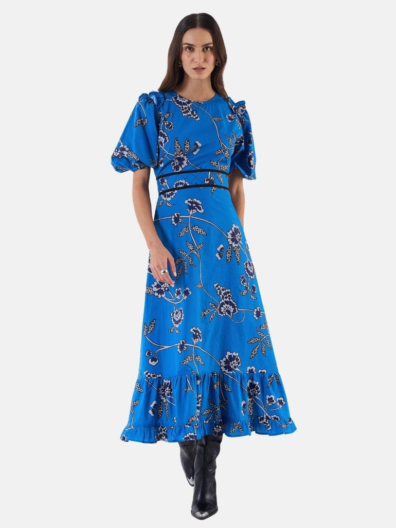 The Antonia is a wonderful choice for special occasions and everyday agendas alike. Cut with puffed sleeves, elastic cuffs and adorned with subtle frills, the Antonia falls to a slender A-line creating a flattering silhouette. Accentuate the waist with the featured belt. Antonia is crafted from crisp cotton poplin, breathable and soft against the skin. The print evokes childhood days by the river, collecting wildflowers to press as keepsakes. The design recalls the memory of finding those blooms preserved in an old book.