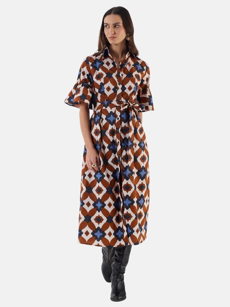 Meet Brooke - a polished midi shirt dress with a crisp, tailored silhouette and feminine flair. Featuring short, tiered sleeves that add a playful twist to its refined structure, Brooke transitions effortlessly from daytime sophistication to evening elegance. Brooke is crafted from crisp cotton poplin, breathable and soft against the skin. Nature's patterns inspire the 'Mosaic' print, reimagining organic designs like layered scales and lattices in a contemporary, simplified style.