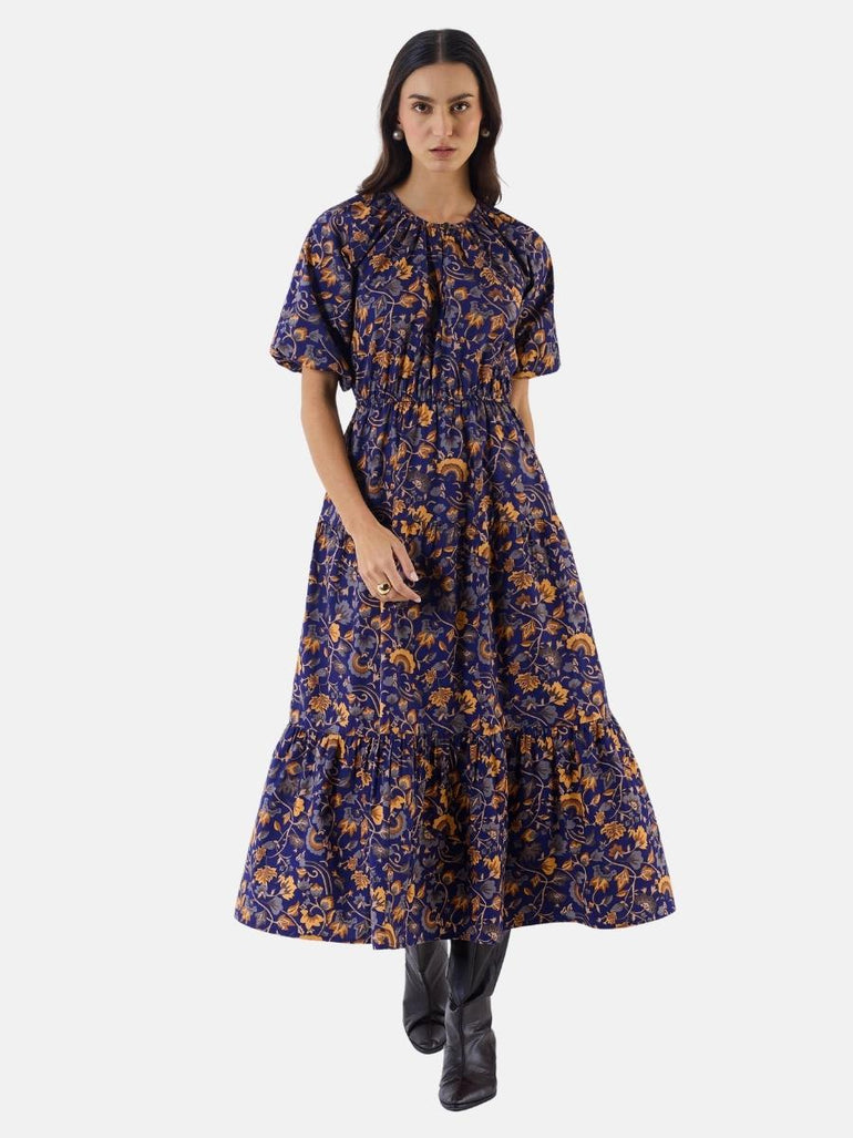 The Maple dress is your go-to for effortless style, equally perfect for a leisurely city stroll or a serene country escape. Its tiered A-line silhouette and elastic waist offer a flattering fit, while the V-neck with a button closure and short raglan sleeves add understated charm. Maple is crafted from crisp cotton poplin, breathable and soft against the skin. The print is inspired by the last blooms of the season, scattered across the ground as autumn settles in, capturing nature’s final flourish before winter.