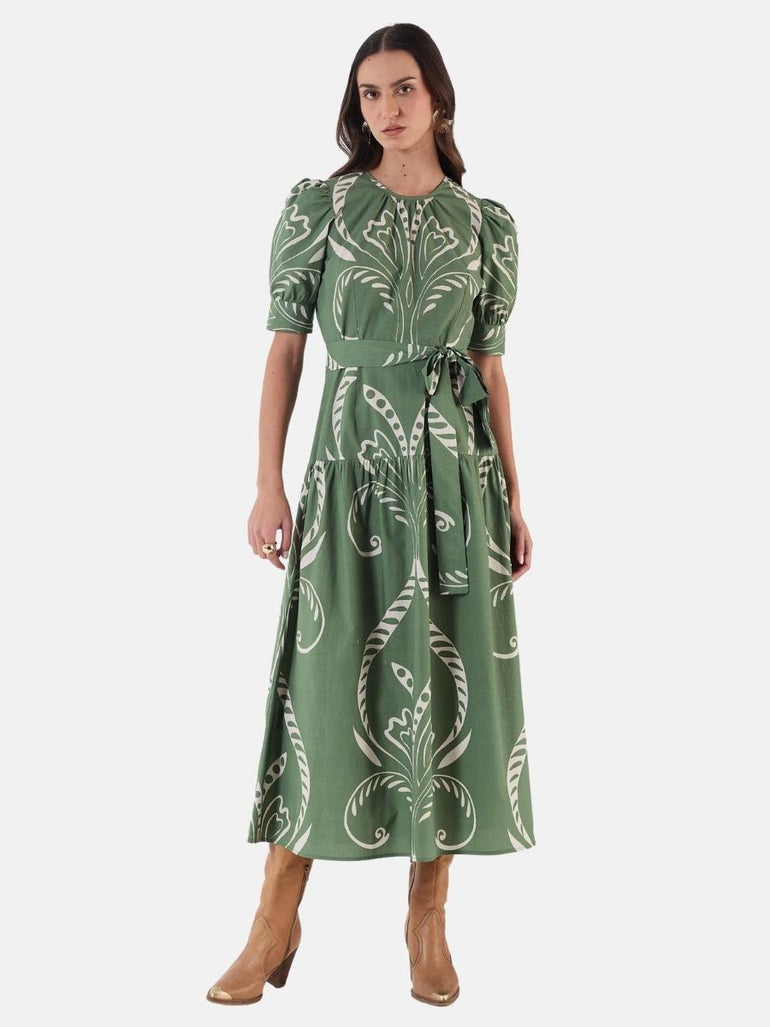 1185 Hazel Puff Sleeve A Line Poplin Dress in Green