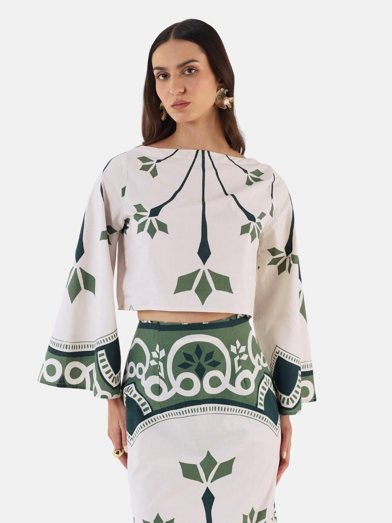 Elevate your everyday style with the Hudson blouse. Hudson features a boat neck and flattering long waterfall sleeves that create a streamlined silhouette. The cropped, slightly boxy shape adds a touch of modern sophisti- cation. Crafted for comfort, this blouse looks great with our fitted Aspen skirt for a refined, put-together look, or paired with high-waist- ed jeans for a chic, effortless ensemble. Hudson is crafted from crisp cotton poplin, breathable and soft against the skin. 'Awak- ening' captures the connection between nature and light, portraying flowers bloom- ing as they awaken to the morning sun.