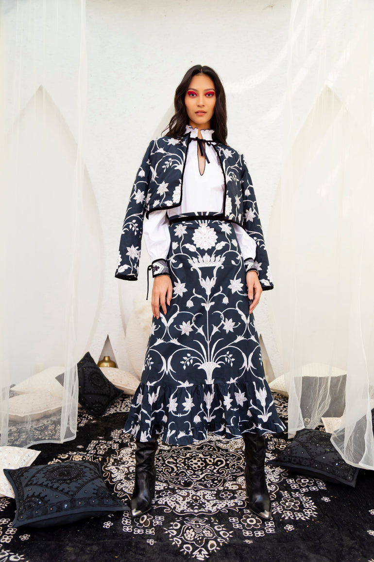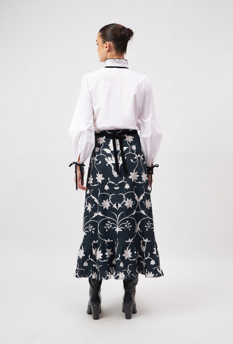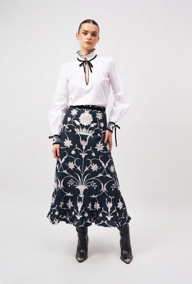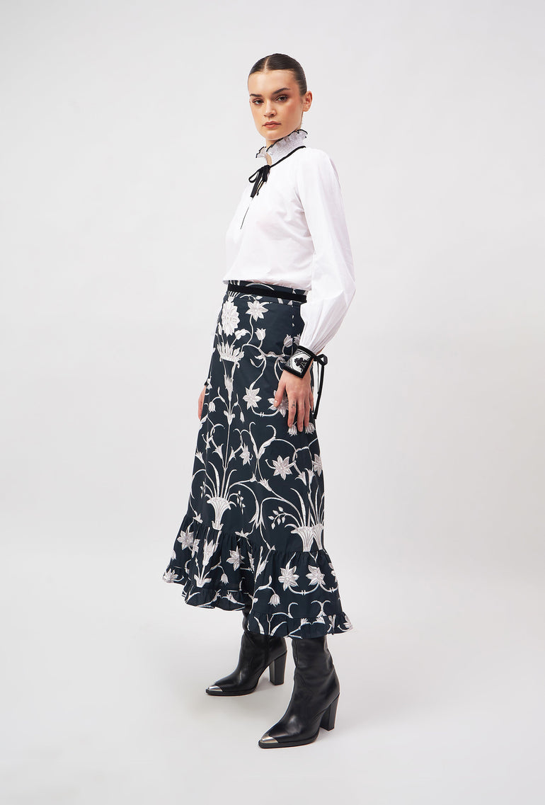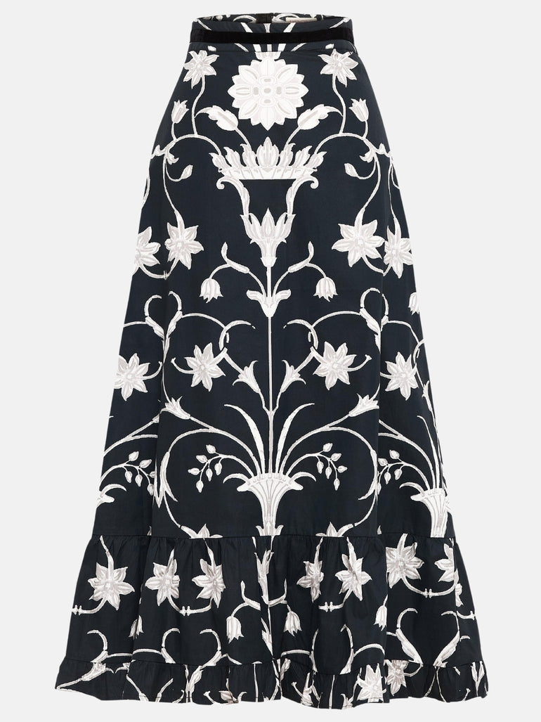 Introducing the Aurora - a flattering midi skirt for all occasions. Her high waist and adjustable velvet belt guarantee a flawless fit. The slender A-line falls to an elegant ruffled hem. Style her casually with flats or pair the Aurora with heels for a festive flair. The print design is influenced by ancient Berber-Roman stone carvings found near the city of Meknes in Morocco. The artwork references stylized floral motifs set in perfect symmetry.