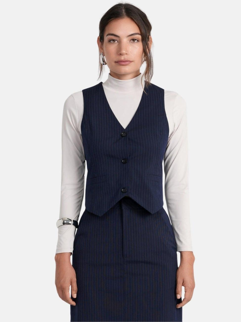 The Alex Vest is sharply tailored from classic navy pinstripe suiting fabric, offering a polished, menswear-inspired look with a modern edge. Its structured silhouette and front button closure create a refined finish, while subtle seaming and a clean neckline add definition and shape. Designed to pair seamlessly with the matching Alex Skirt, this versatile vest stands out whether worn layered or styled solo.