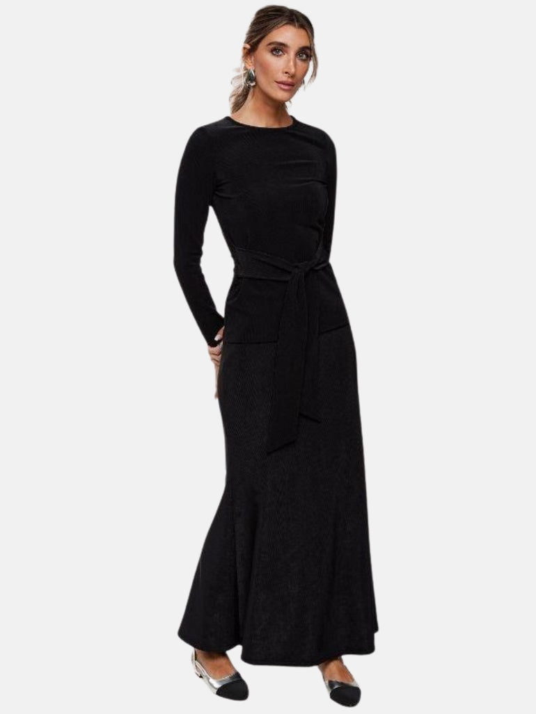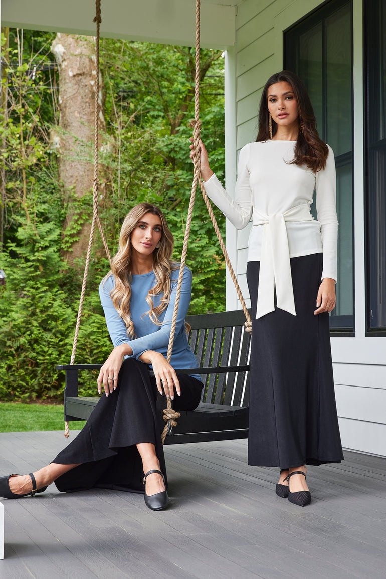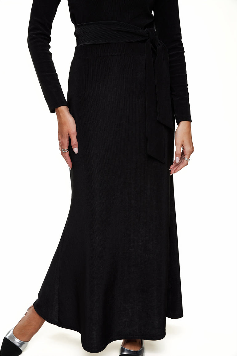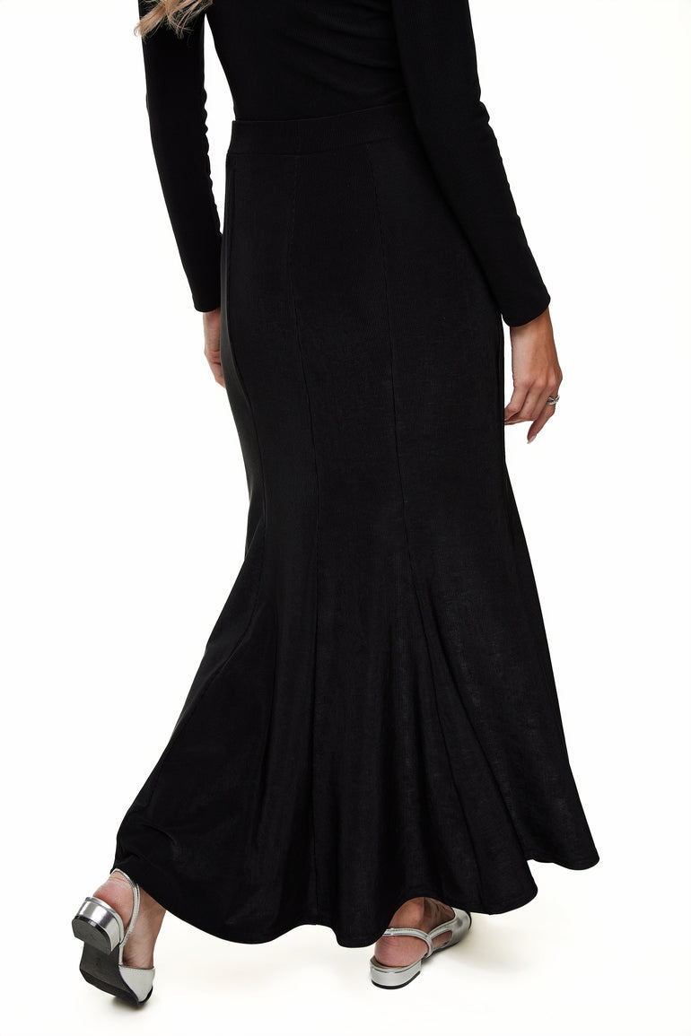 Discover the charm of our Amber Flare Skirt, meticulously crafted from the same micro rib as our newly introduced crewneck. This skirt is perfect for creating a coordinated look with its matching top, yet its classic black hue and versatile design allow it to pair effortlessly with any wardrobe staple. It boasts a distinctive three-panel construction at the back, enhancing the body's natural silhouette and adding a graceful flare. This detail ensures an effortlessly elegant drape that beautifully complements your every movement, making it an essential piece for those seeking refined yet dynamic style elements.