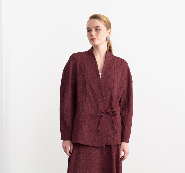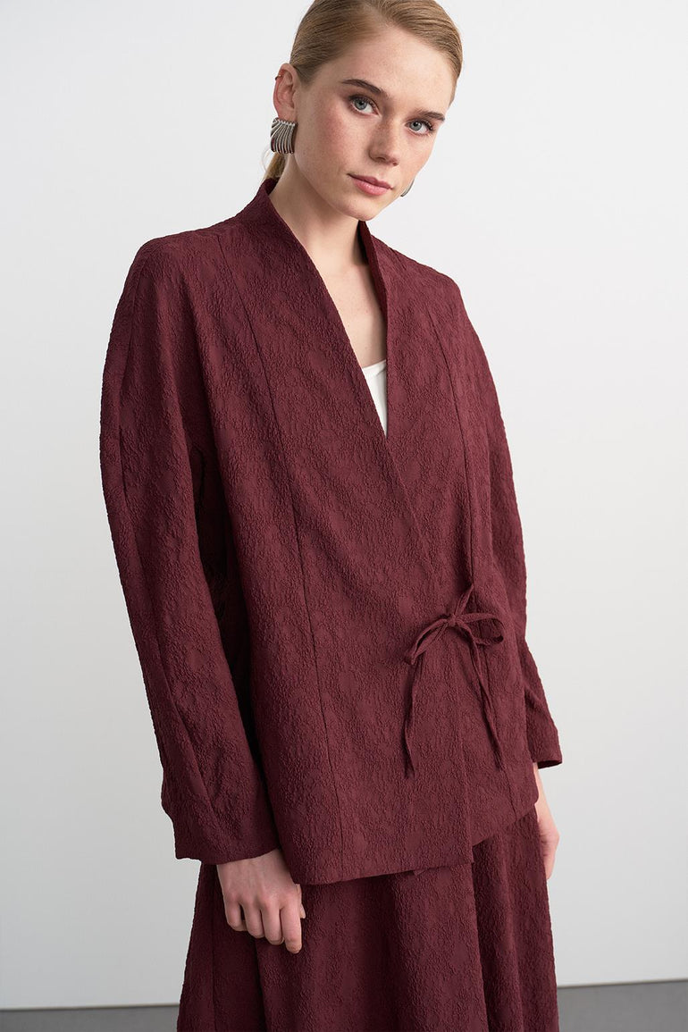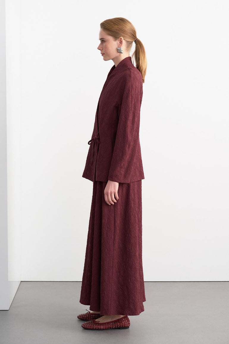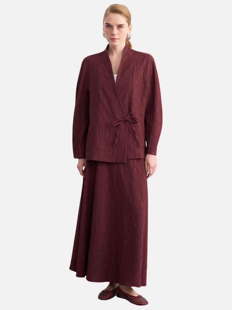 The Ari textured jacket and skirt set offers both elegance and comfort with its specially woven cotton crinkled fabric. The V-neck design and bell-shaped skirt cut create a balanced fit, shaping a graceful silhouette. The jacket's piping tie detail adds a modern touch, while the high-waisted, elasticated back skirt provides freedom of movement. For special occasions, you can achieve a sophisticated look by pairing it with an elegant blouse and high heels, or create a minimalistic style with simple accessories. With its timeless design, this set will become a staple in every wardrobe!