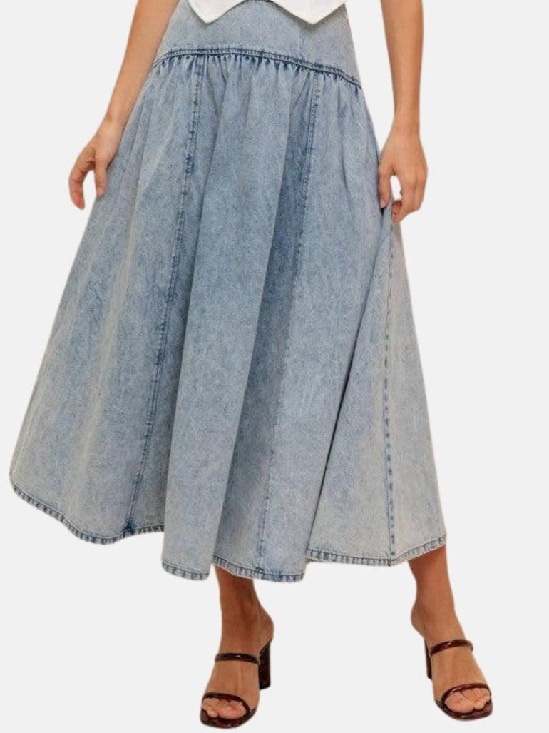 This midi skirt features acid-washed denim and a zipper closure at the back.