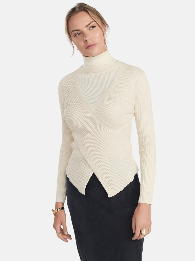 A refined essential with a modern twist. This ribbed knit sweater features an elegant wrap-front V neckline that flatters the figure and adds dimension to any layered look. The asymmetrical hem creates subtle movement, while the fitted silhouette makes it ideal for tucking into skirts or tailoring. Crafted in a soft cream hue that pairs effortlessly with everything from neutrals to bold color, it's a piece you'll reach for season after season.