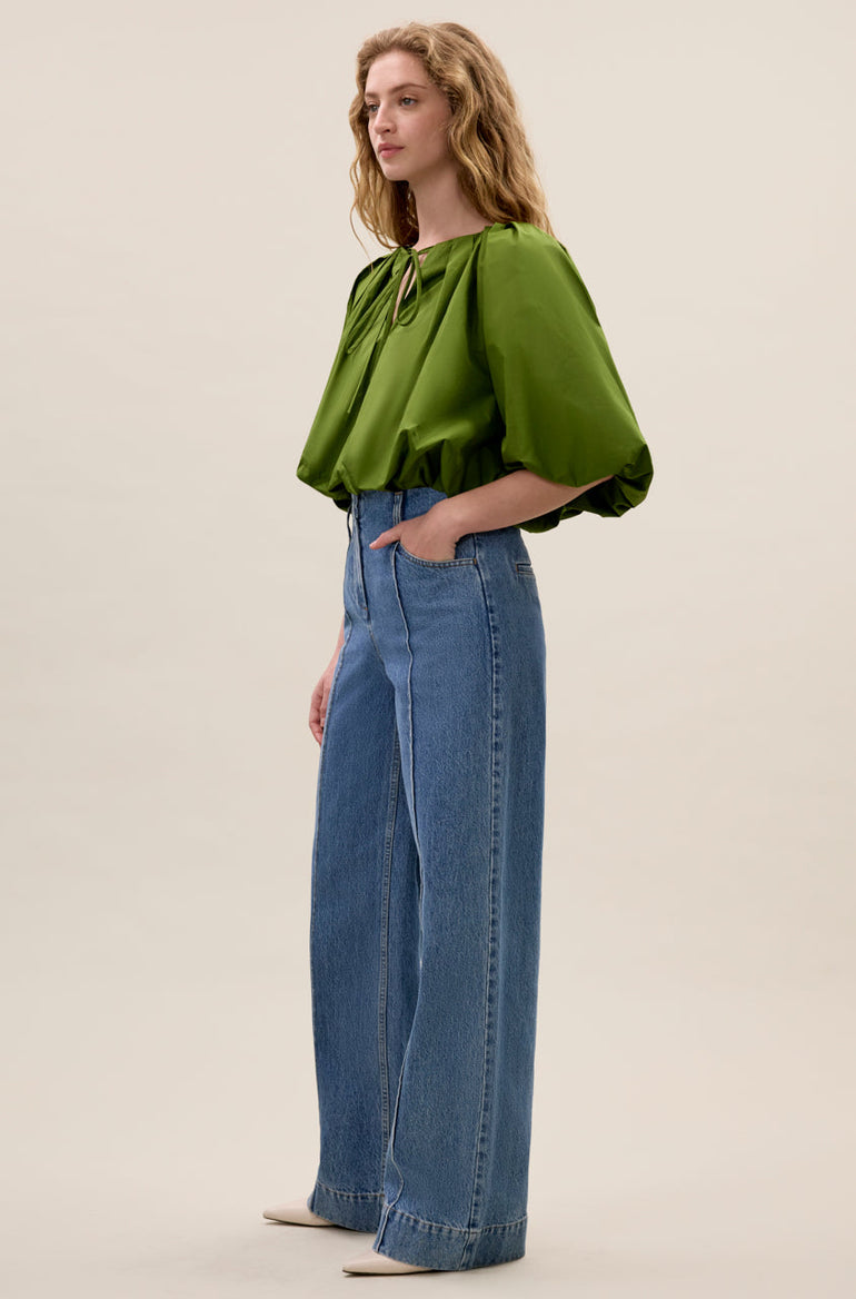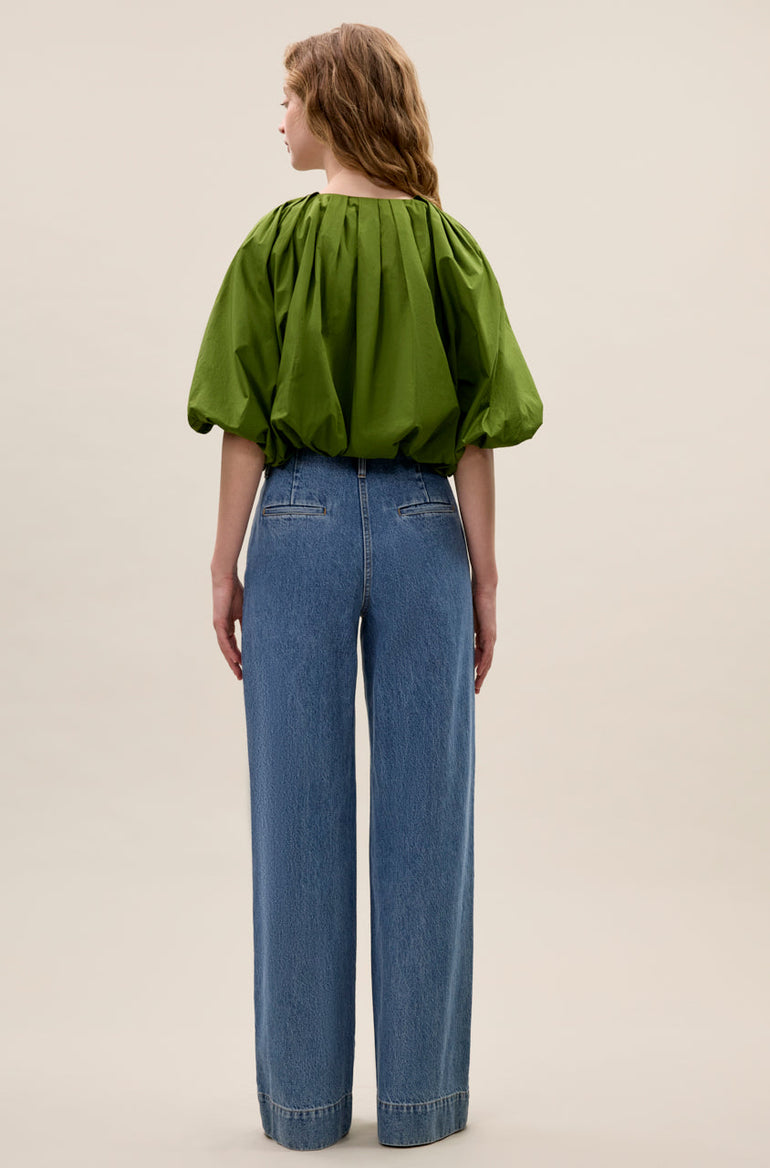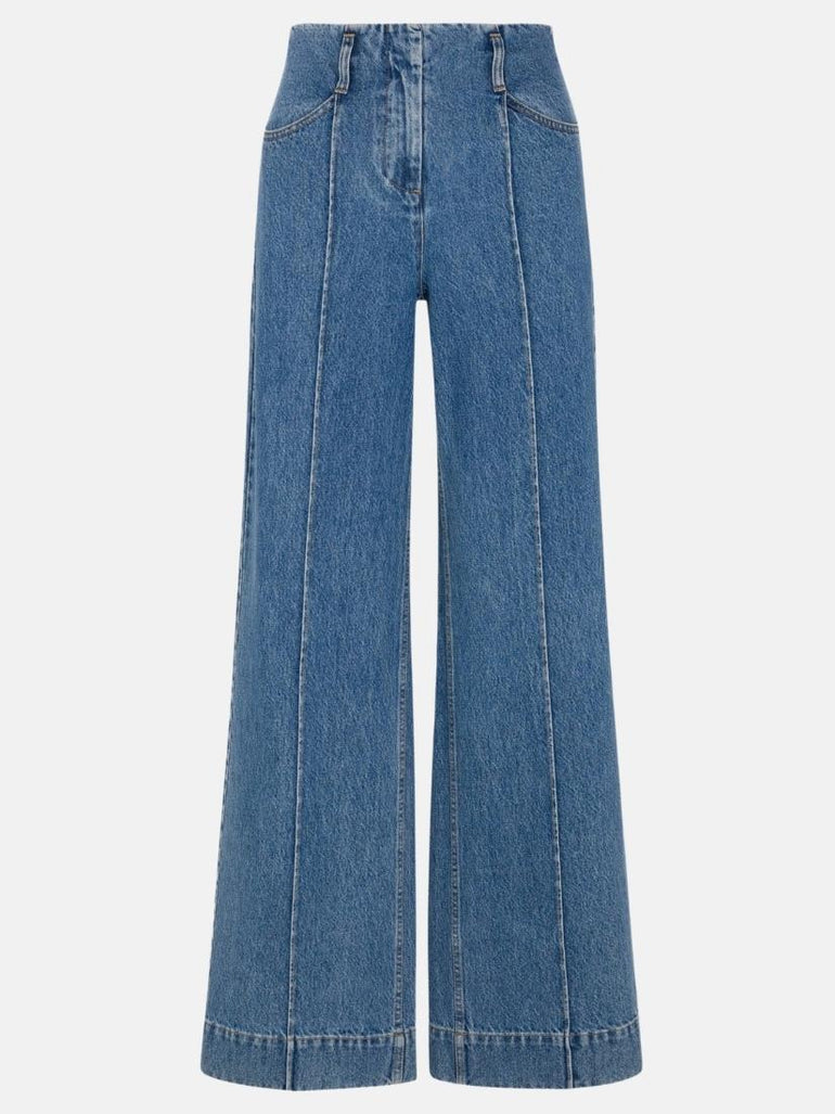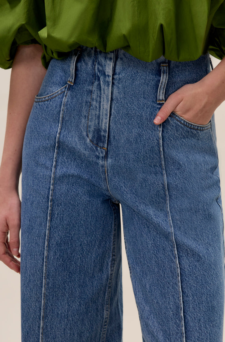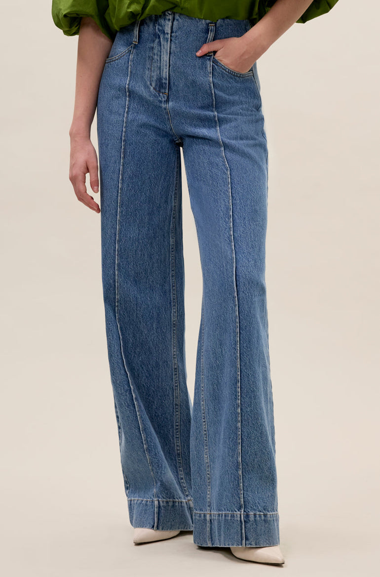 A refined twist on a timeless classic, these wide-leg denim pants in a medium Dax wash feature crisp topstitching and pintuck details that elevate your everyday look. Crafted for comfort and modern sophistication, they’re designed to be both versatile and stylish.