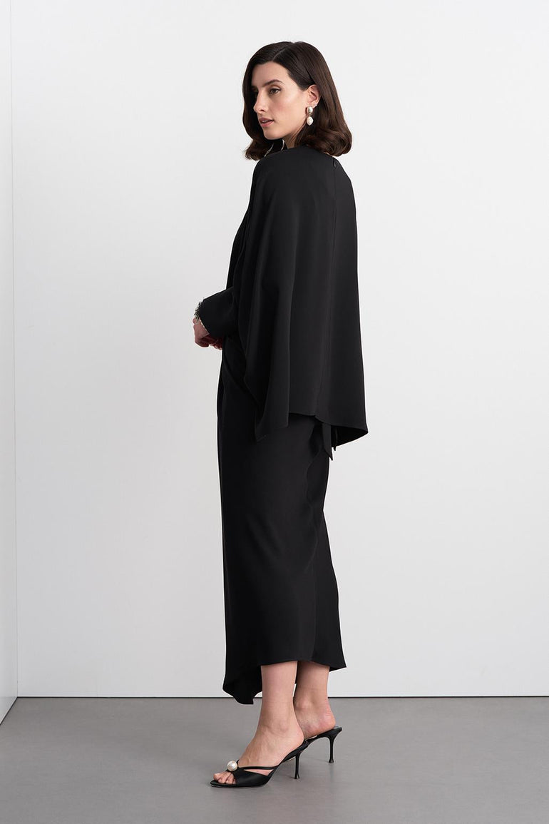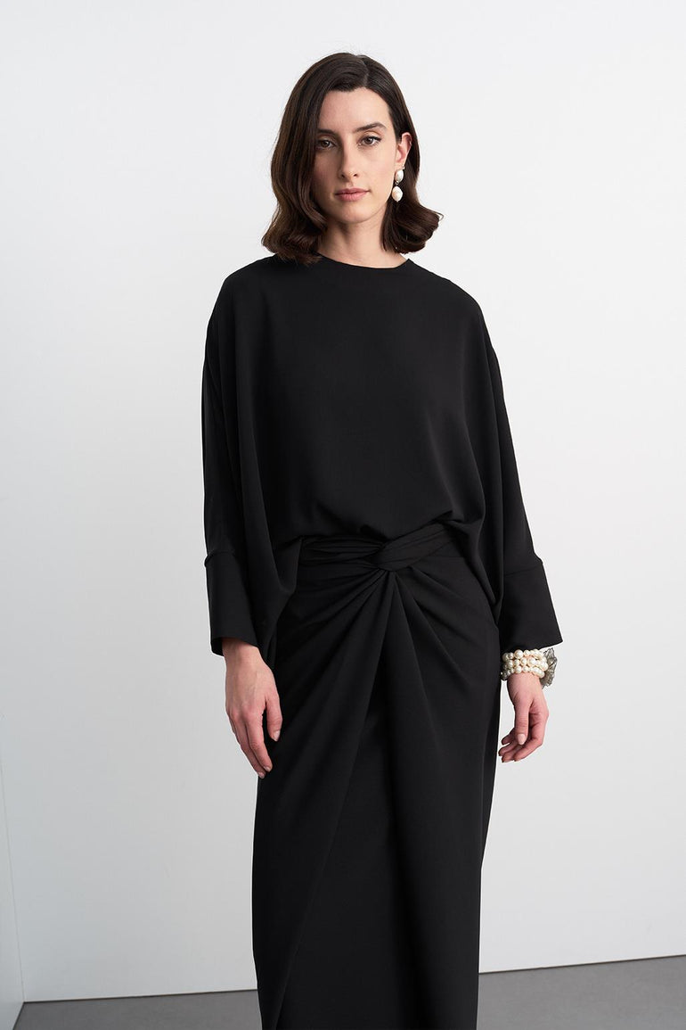 Blouse: Soft-textured crepe fabric, round neckline, batwing sleeves, double cuffed sleeves, blouse with slit details.