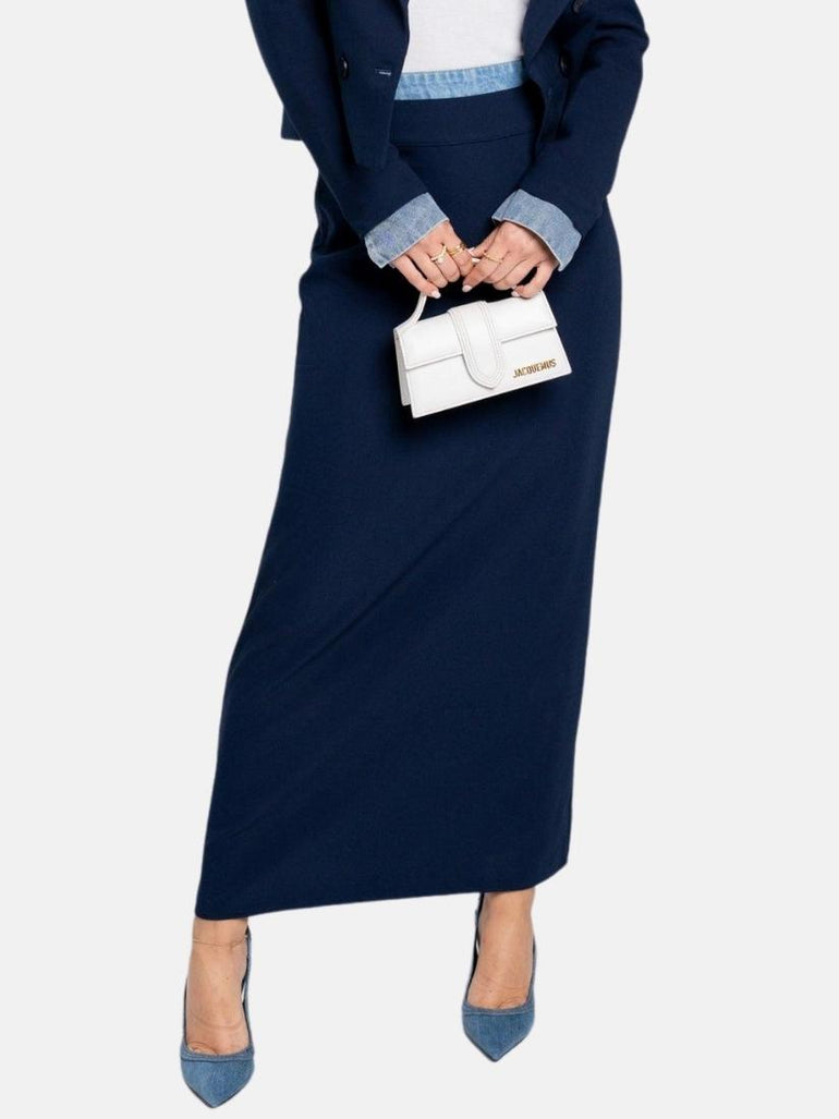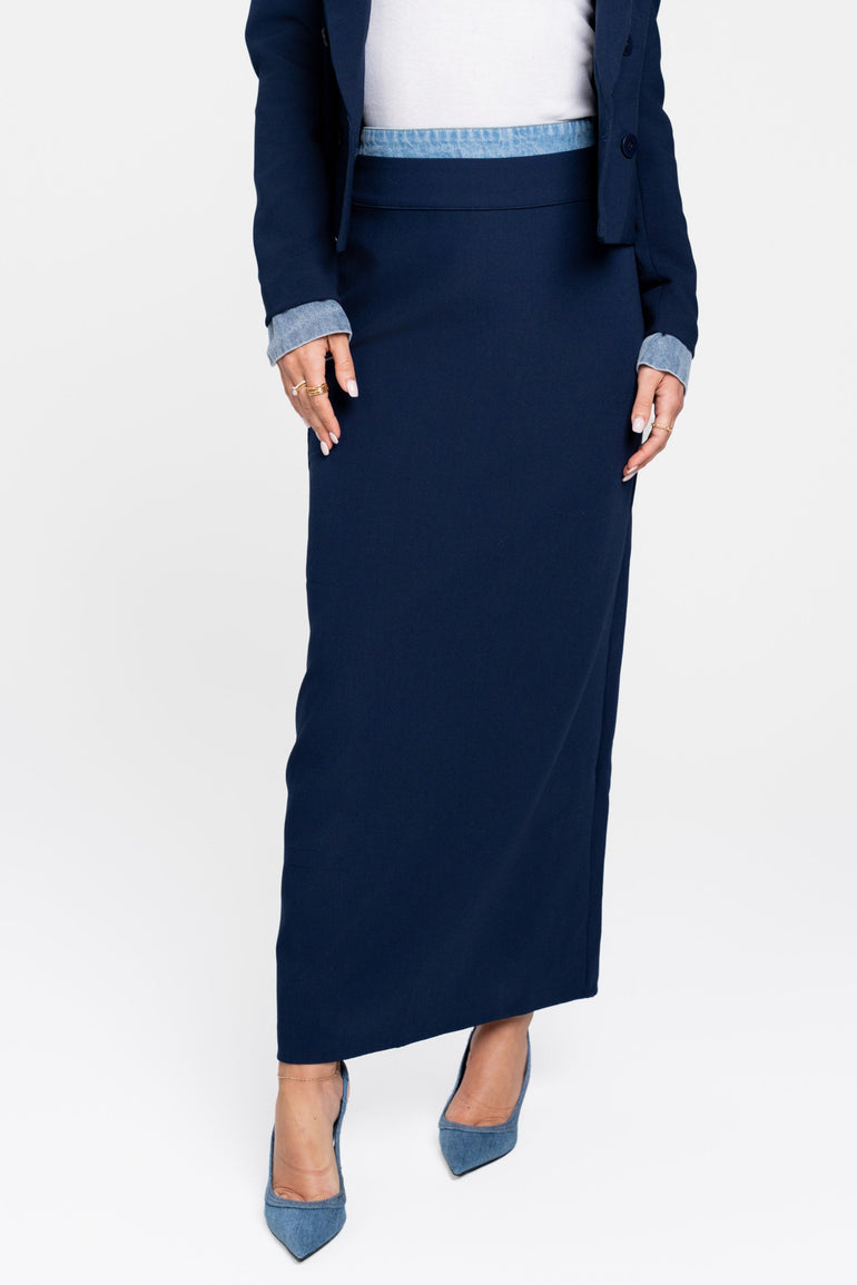 - The Elizabeth Skirt is a maxi-length silhouette, crafted from classic suiting fabric and finished with a denim waistband that adds a subtle, modern contrast.