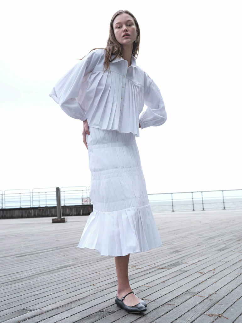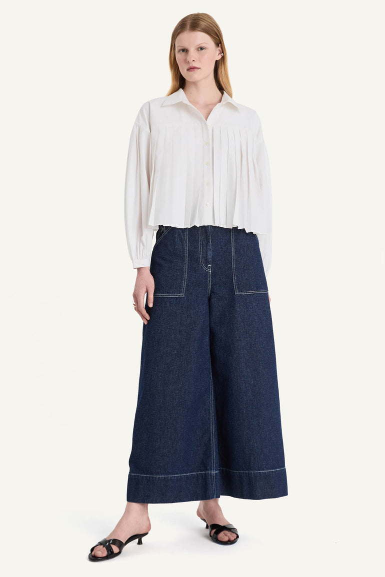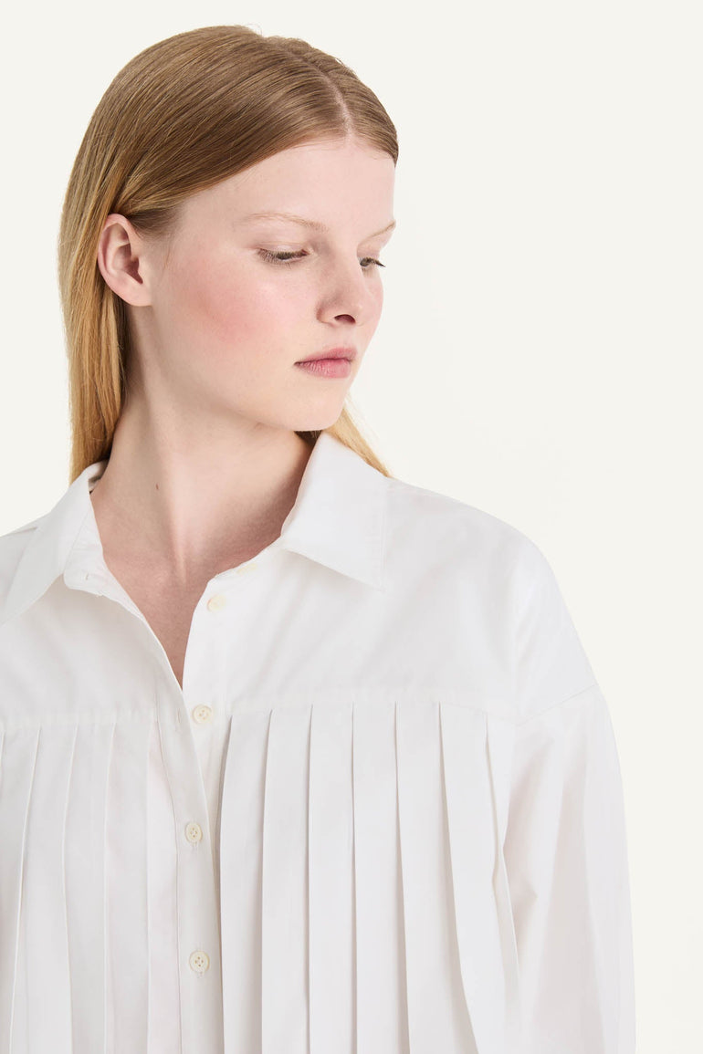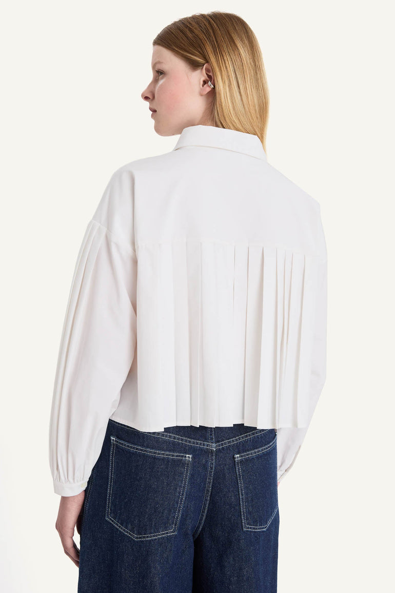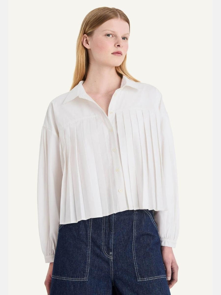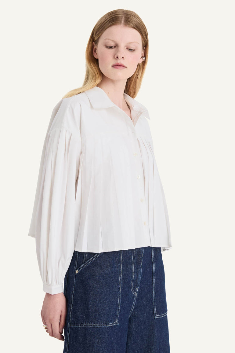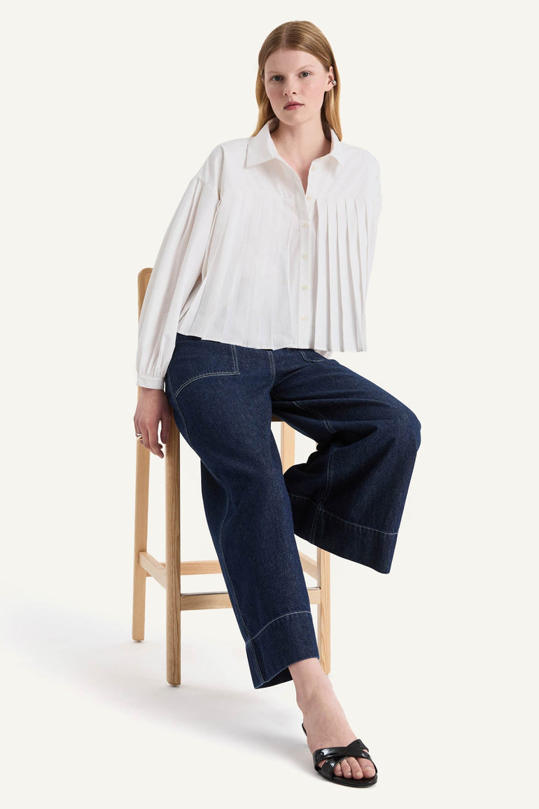 The FRESCO Top is a versatile button-front cropped shirt in our breathable cotton poplin blend. Featuring permanent pleats that lend a sense of movement, this long-sleeved style boasts a dropped shoulder for a relaxed yet chic silhouette. Unlined for a lightweight feel, the FRESCO Top is the epitome of understated elegance – perfect for the office or a day exploring the town when styled with the VIOLETTE Jean.