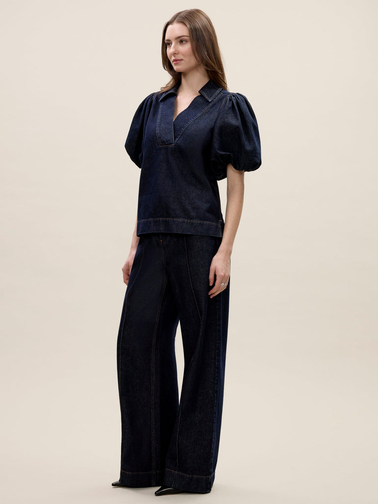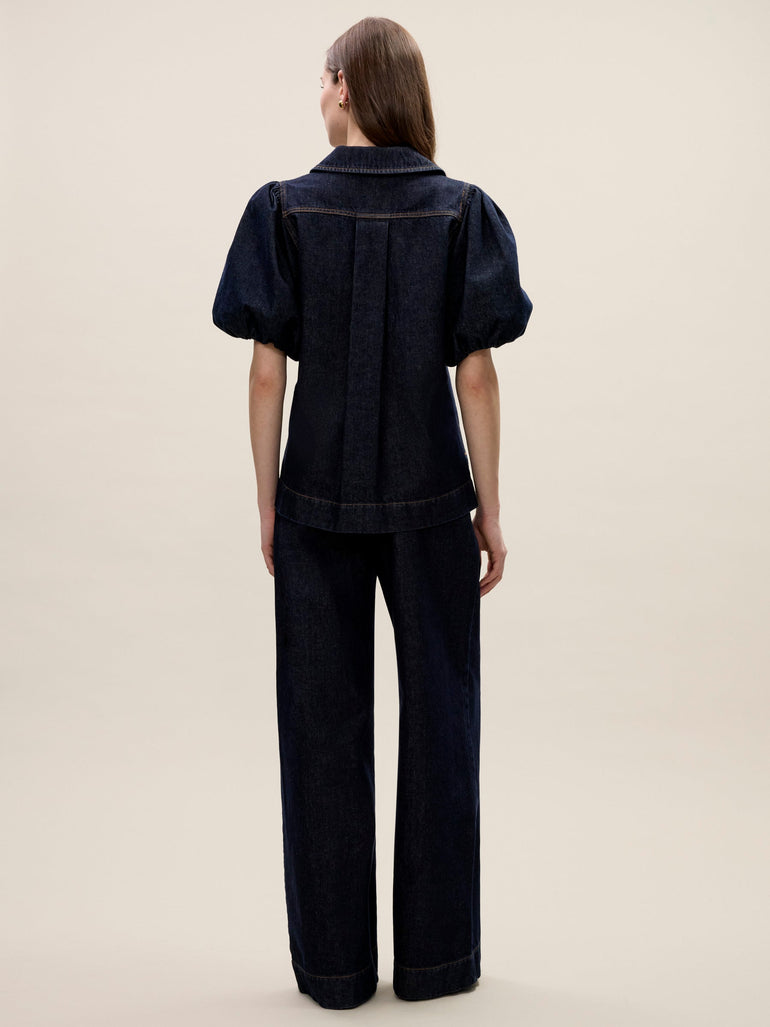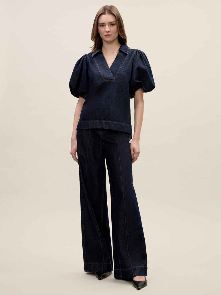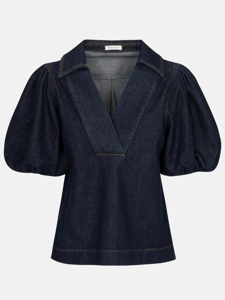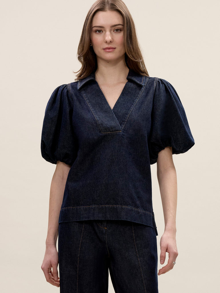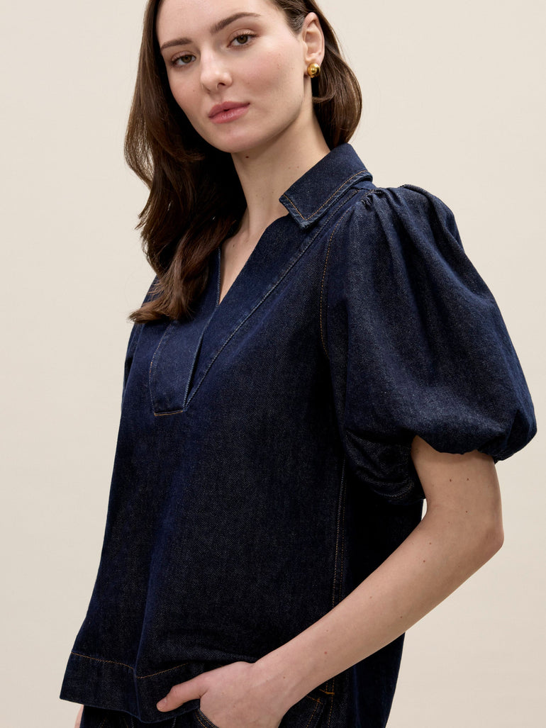 The this denim top in deep sea wash brings a modern twist to classic denim styling. This short-sleeve top features refined topstitching details that enhance its structured design, while the fully lined sleeves provide added comfort.