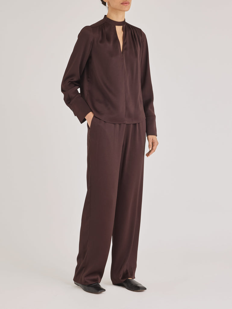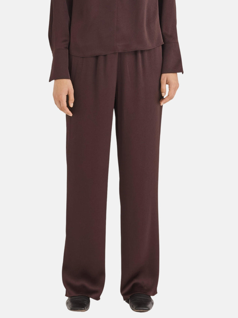 This luxurious silky wide leg pant in a deep raisin hue offers effortless sophistication for any occasion. Crafted from smooth hammered satin, it features a comfortable pull-on design with a refined drawstring closure for a perfect fit.