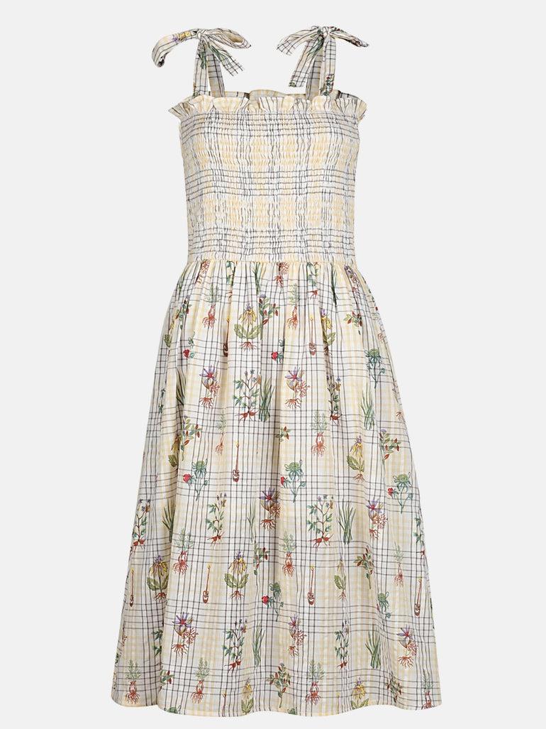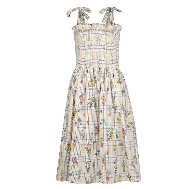 The gorgeous smocking dress made from upcycled fabric, featuring a stunning healing herbs print that's sure to make you feel like a goddess. The vintage vibe of this smock will transport you back in time, while the nourishing herbs on the print will remind you to take some time for yourself and enjoy the simple things in life. Our smock is perfect for a day out in the sun or a lazy afternoon spent lounging around at home. The loose, comfortable fit means you can move around freely without feeling restricted, and the smocking detailing adds a touch of elegance and femininity. But that's not all - by choosing a dress made from upcycled fabric, you're not only doing your part to protect the environment, but you're also making a statement about your commitment to sustainability and ethical fashion.