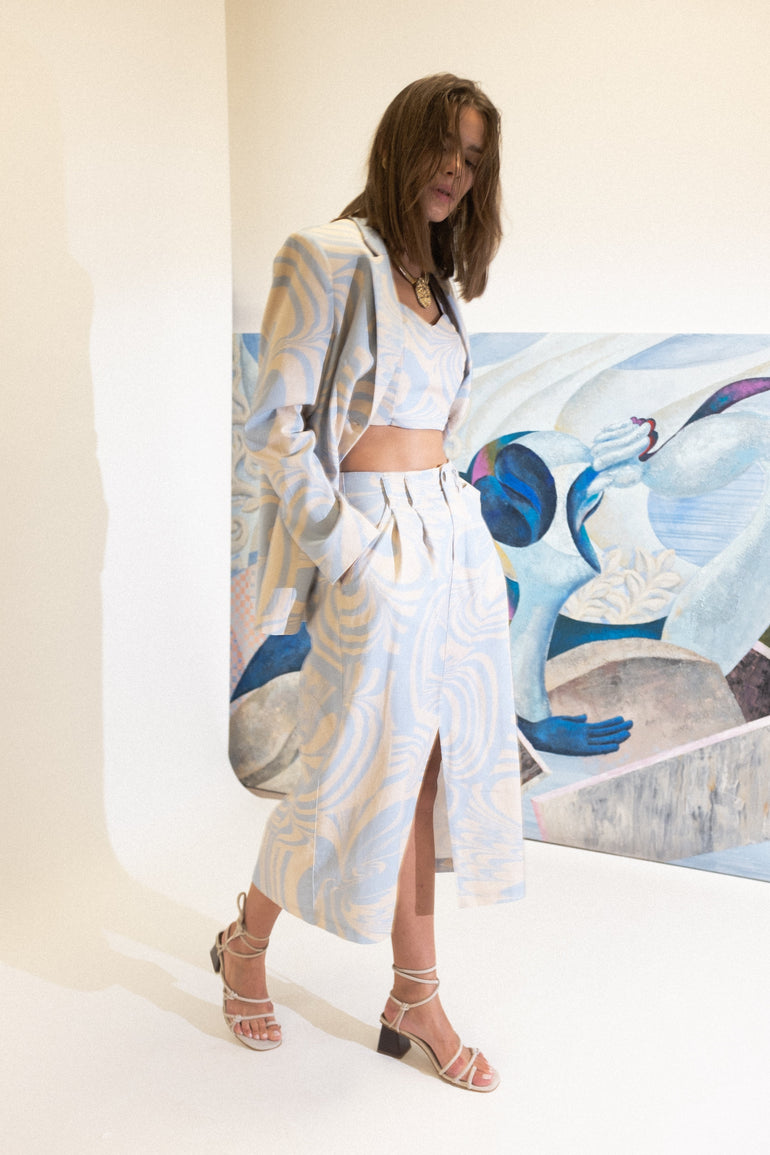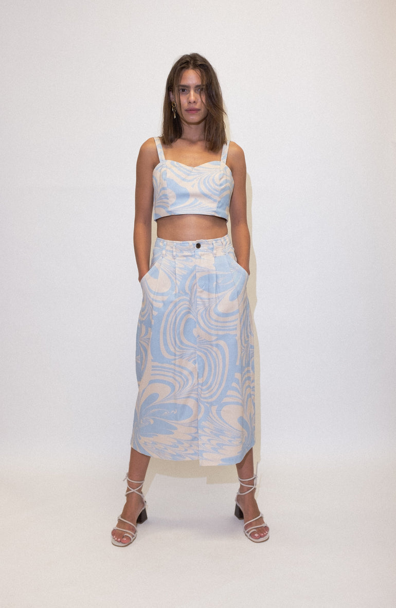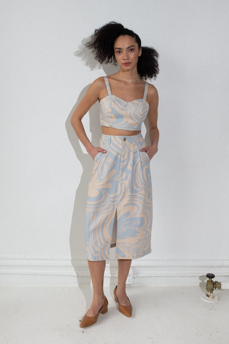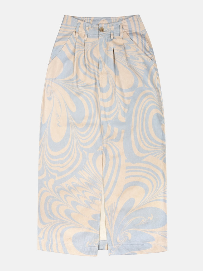 The Kandran skirt features UIM custom marbled artwork Nuva Sky. Our twist on the pencil skirt, cut from soft certified organic cotton twill. A midi length skirt with front slit and pleated at the waist. Features two front pockets, and belt loops.