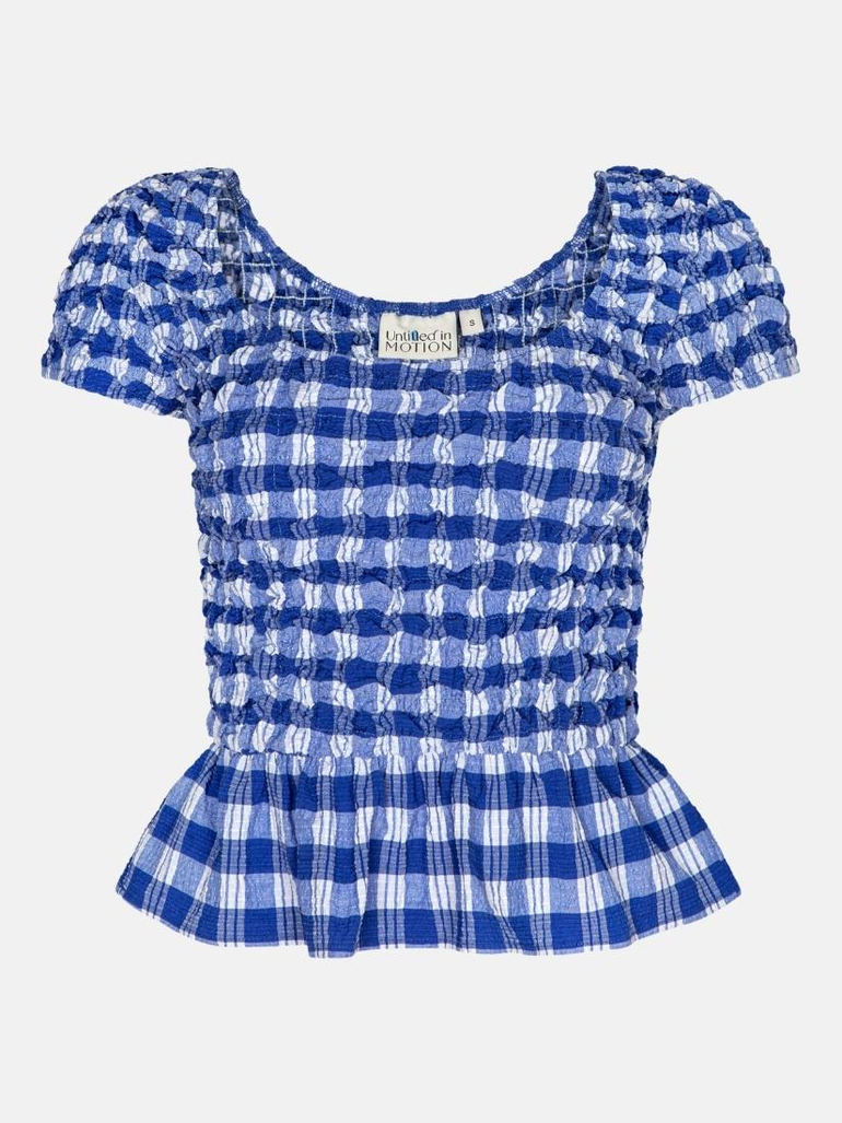 The Karem Top is a flirty short-sleeve blouse crafted from Textured Cotton. Featuring UIM custom woven Ios Check, this feminine top has two way ruching for a flattering and comfortable fit, a ruffle hem and capped sleeve