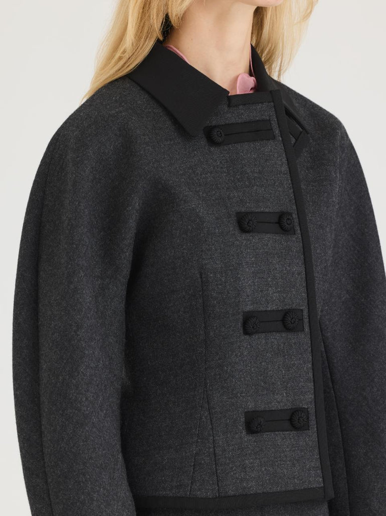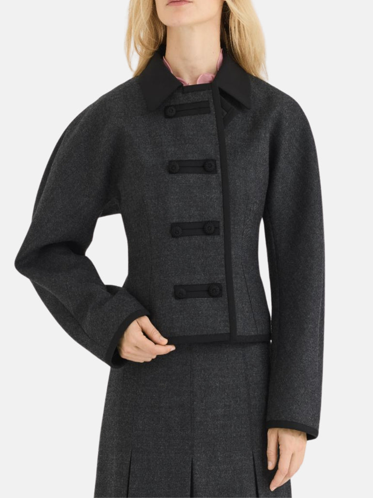 This sophisticated Femme Military Jacket in charcoal exudes refined elegance with a touch of authority. It's adorned with distinctive soutache buttons for a polished finish.