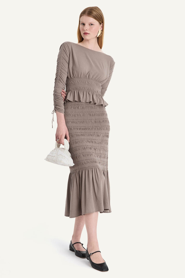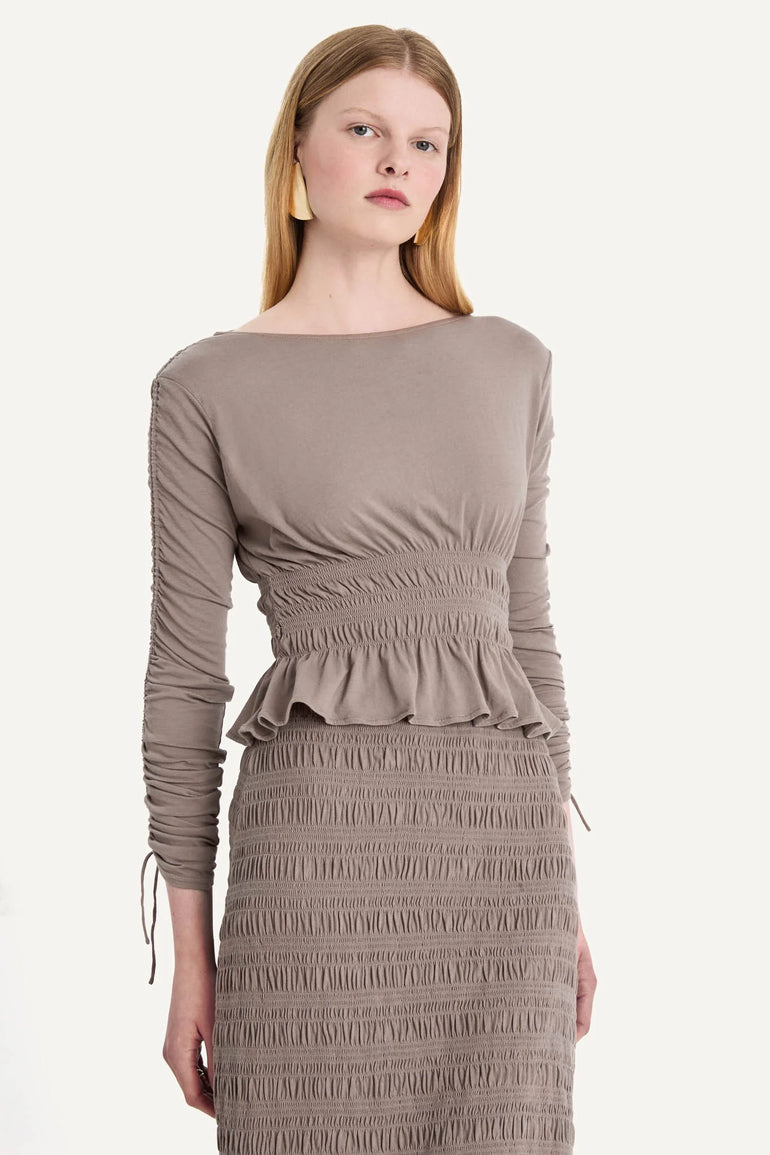 The MARE Top is a versatile wardrobe essential, crafted from a lightweight cotton jersey. Its cropped silhouette, accented by elastic smocking, lends a flattering fit and subtle textural interest. The long sleeves feature adjustable drawcords, while the relaxed boatneck neckline exudes an air of understated elegance. This top pairs perfectly with the SEREDA Skirt for a chic, coordinated ensemble. The MARE Top is fitted throughout the bodice and sleeve and is true to size.