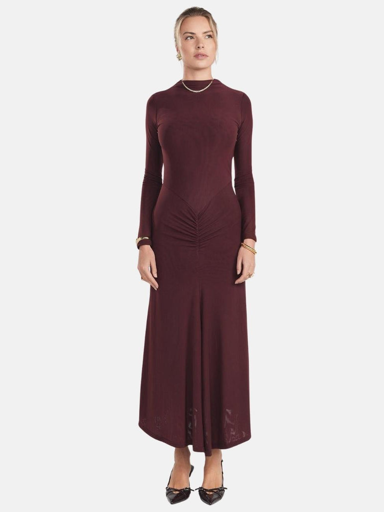 The Maroon Ruched Maxi Dress is crafted from a lightweight mesh fabric that drapes beautifully and offers stretch for a flattering and comfortable fit. Designed with a high neckline and long sleeves, the silhouette is elevated by delicate ruching at the waist, creating soft shape and dimension. The rich maroon tone adds depth, making it a standout piece for both day and evening occasions.