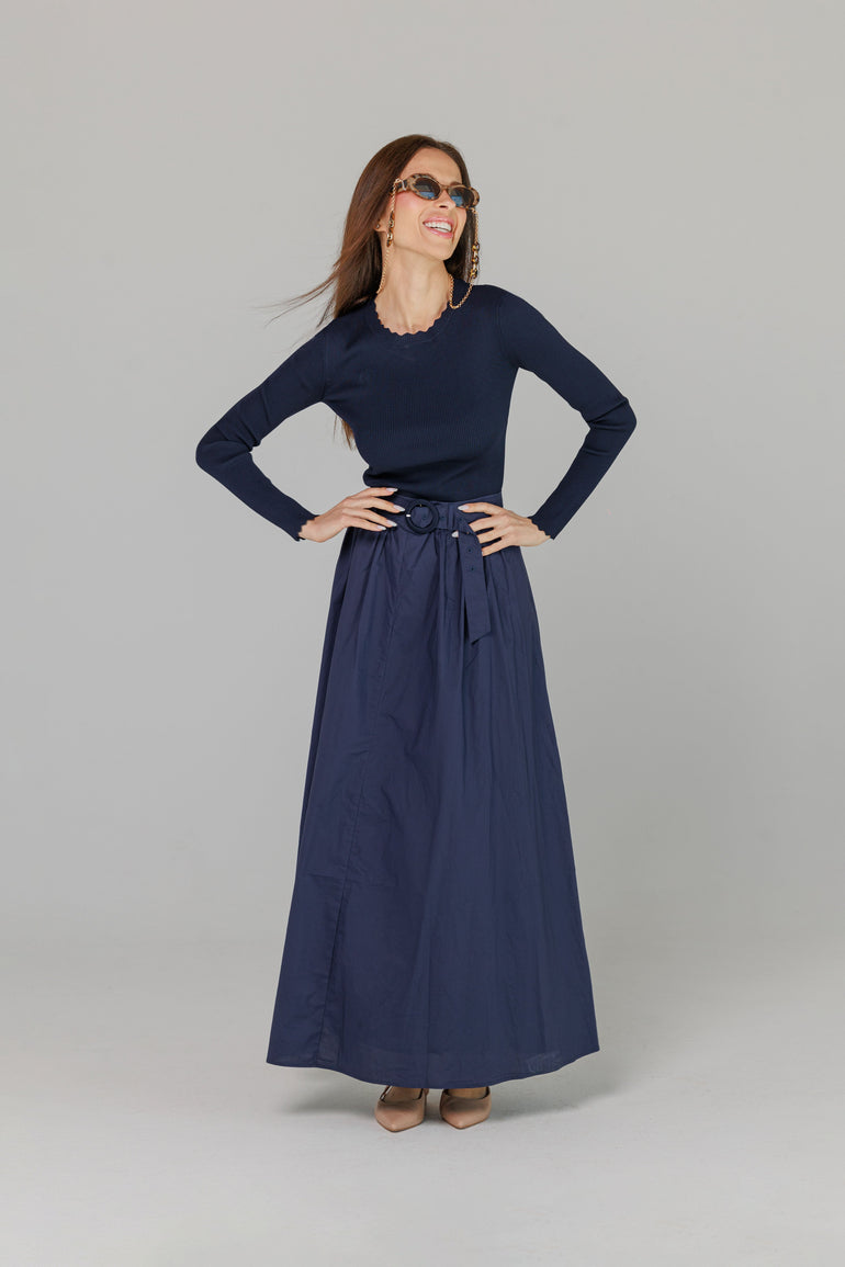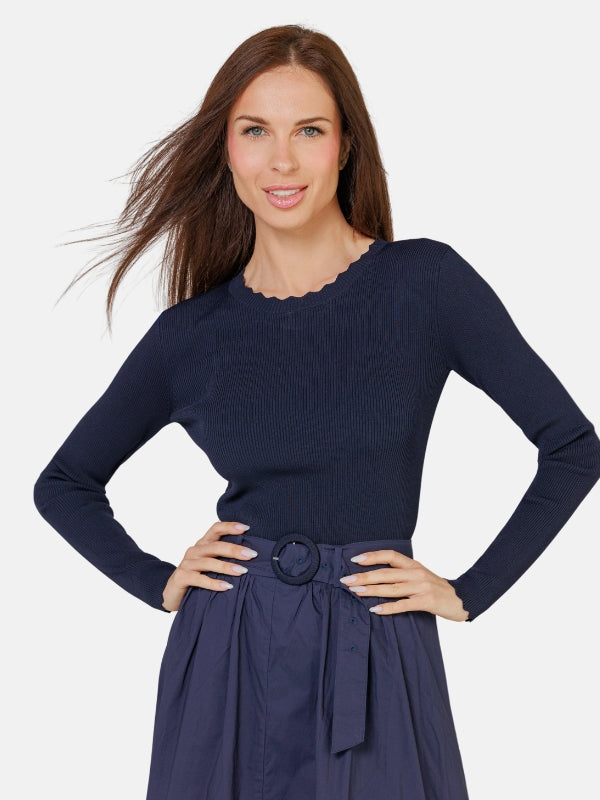 Crafted from a breathable, summery fabric, it offers an elevated feel while keeping you comfortable. Delicate scalloped details at the neckline and sleeves add a touch of elegance, making it easy to dress up or down for any occasion. Pairs perfectly with our Navy Flair Skirt.