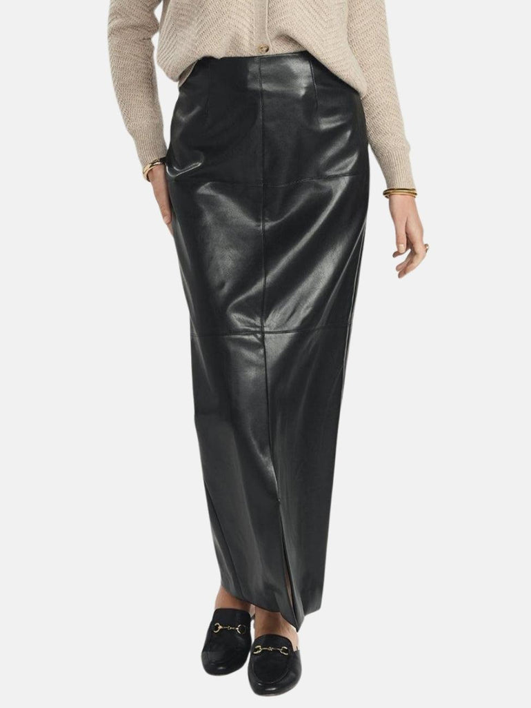 The Panel Leather Skirt is a sleek, minimalist essential designed for clean lines and modern versatility. Made from smooth faux leather, this maxi-length silhouette features a seamless front panel with no visible zippers or pockets for a polished, uninterrupted look. The front slit includes a hidden zipper, allowing you to adjust the opening to suit your style or the occasion.
