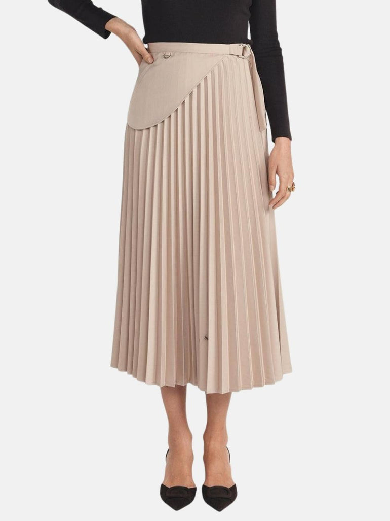 The Panel Skirt features a clean pleated midi silhouette in a soft cream hue, elevated by an asymmetrical overlay for added dimension. Polished yet playful, it’s a modern staple that moves beautifully with every step.
