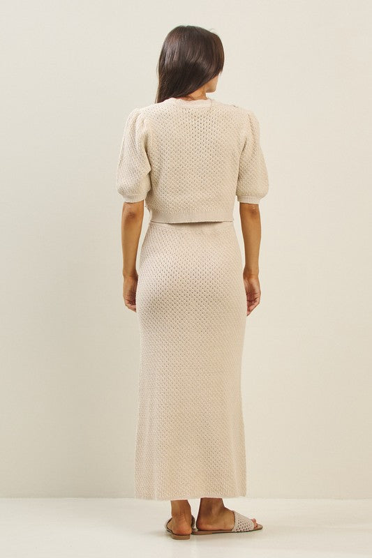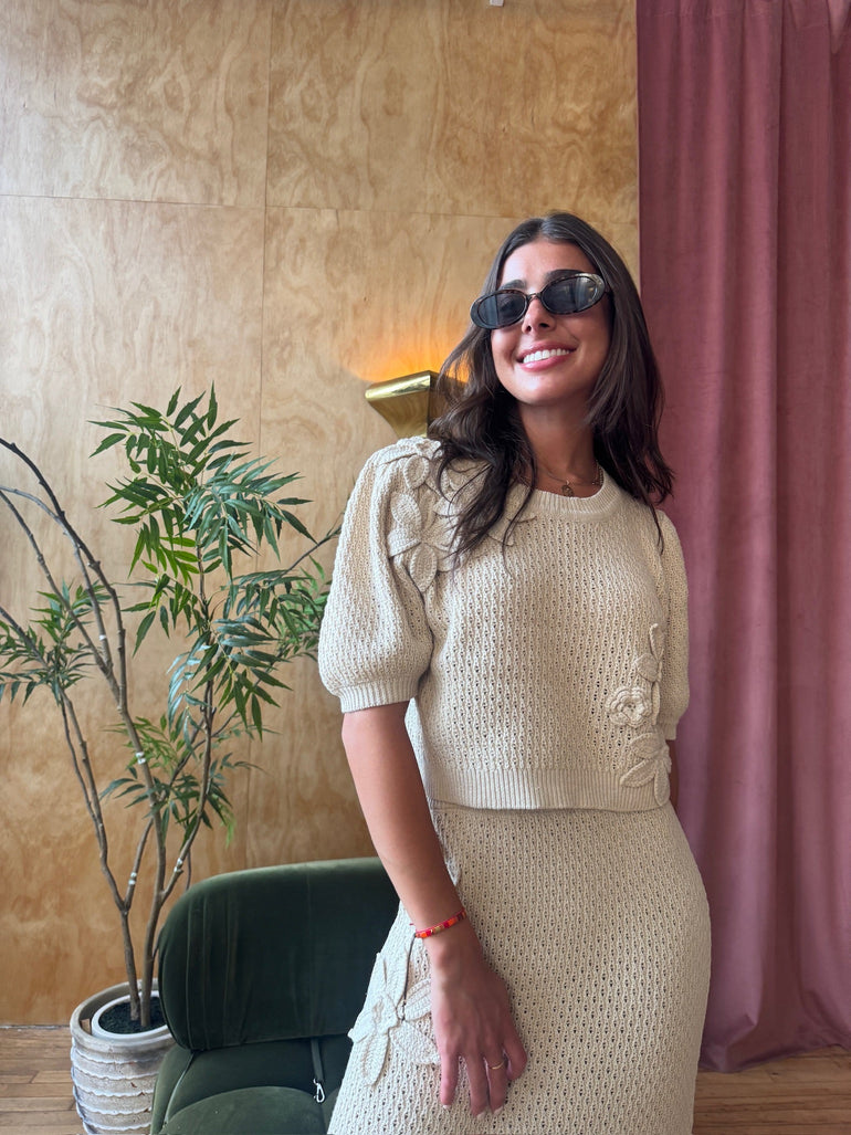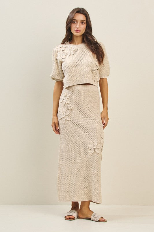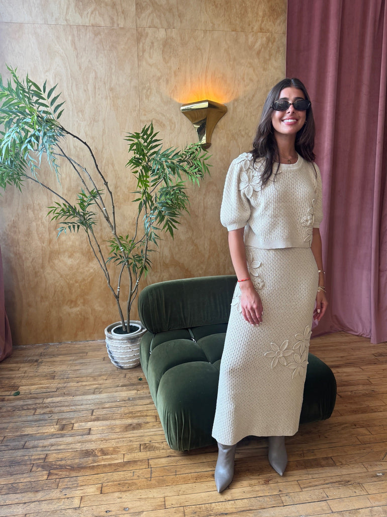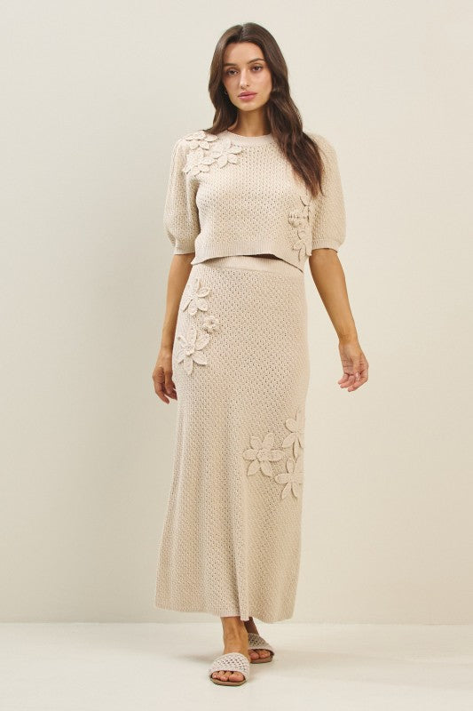 This 3D floral applique knit ensemble features a short-sleeve top paired with a matching skirt. Skirt has elastic Waist. The model, standing 5'8", is shown wearing a US size Small.