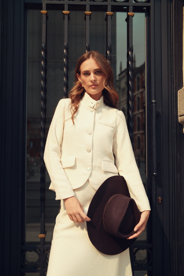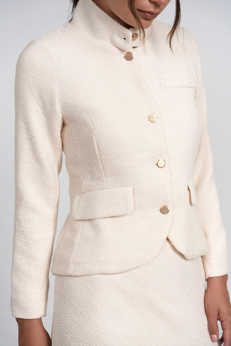 - The Renata Blazer, crafted from lightweight boucle, features a structured silhouette with clean lines