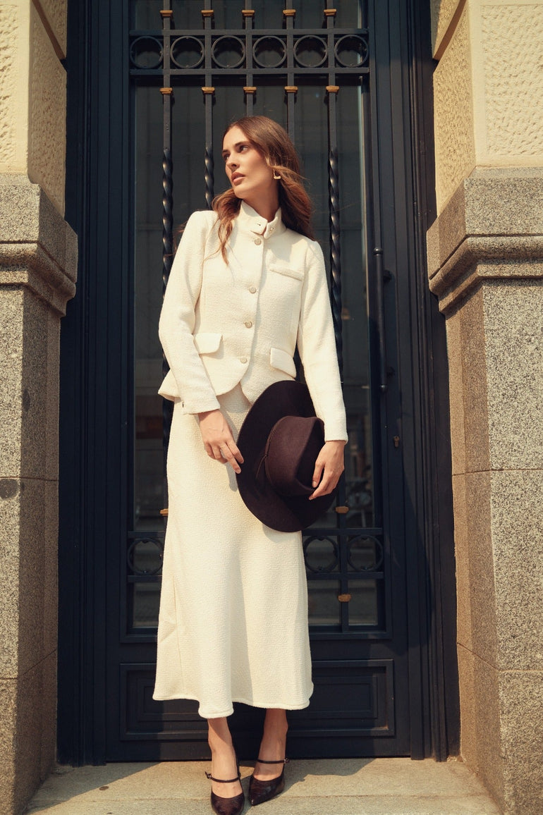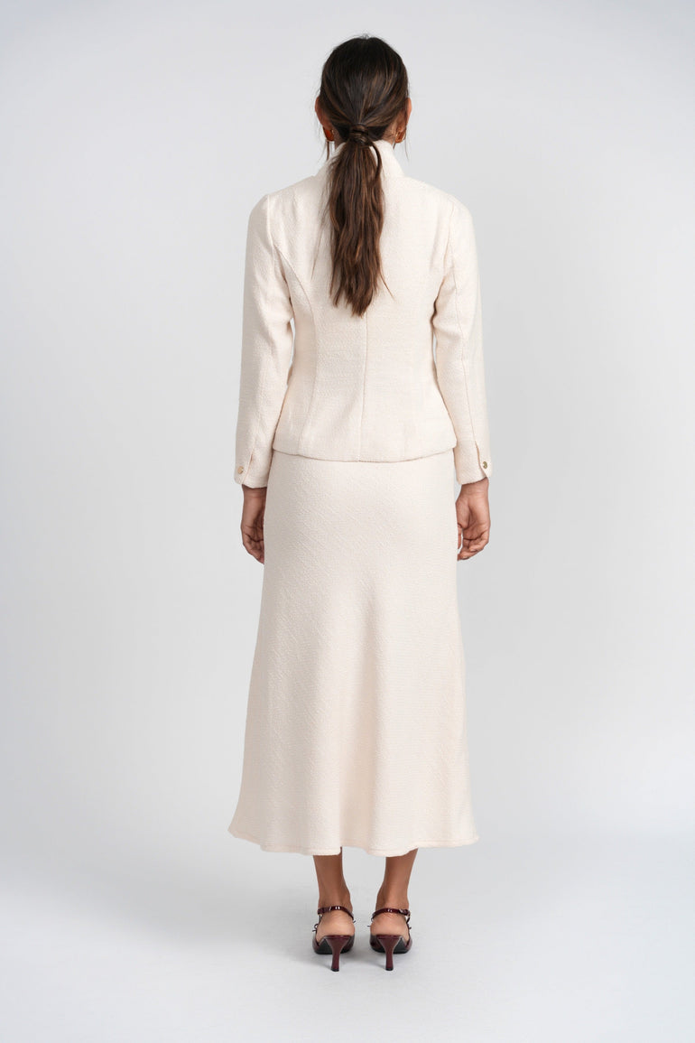 Styling Tip: Style it buttoned over the matching skirt for a polished, coordinated look, or layer it atop tailored trousers and a silk blouse to infuse your workwear with tactile luxury and understated glamour.