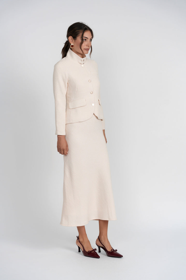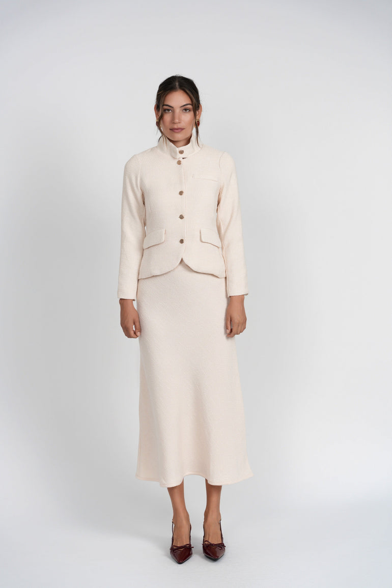 - The Renata Skirt is expertly crafted from lightweight boucle, offering a refined balance between structure and ease