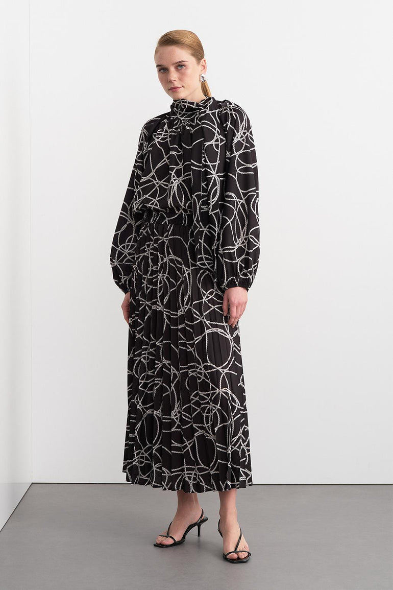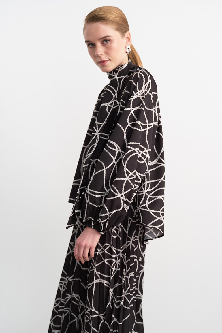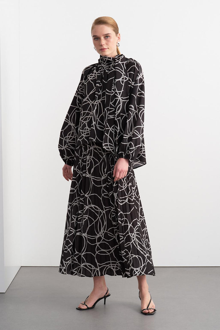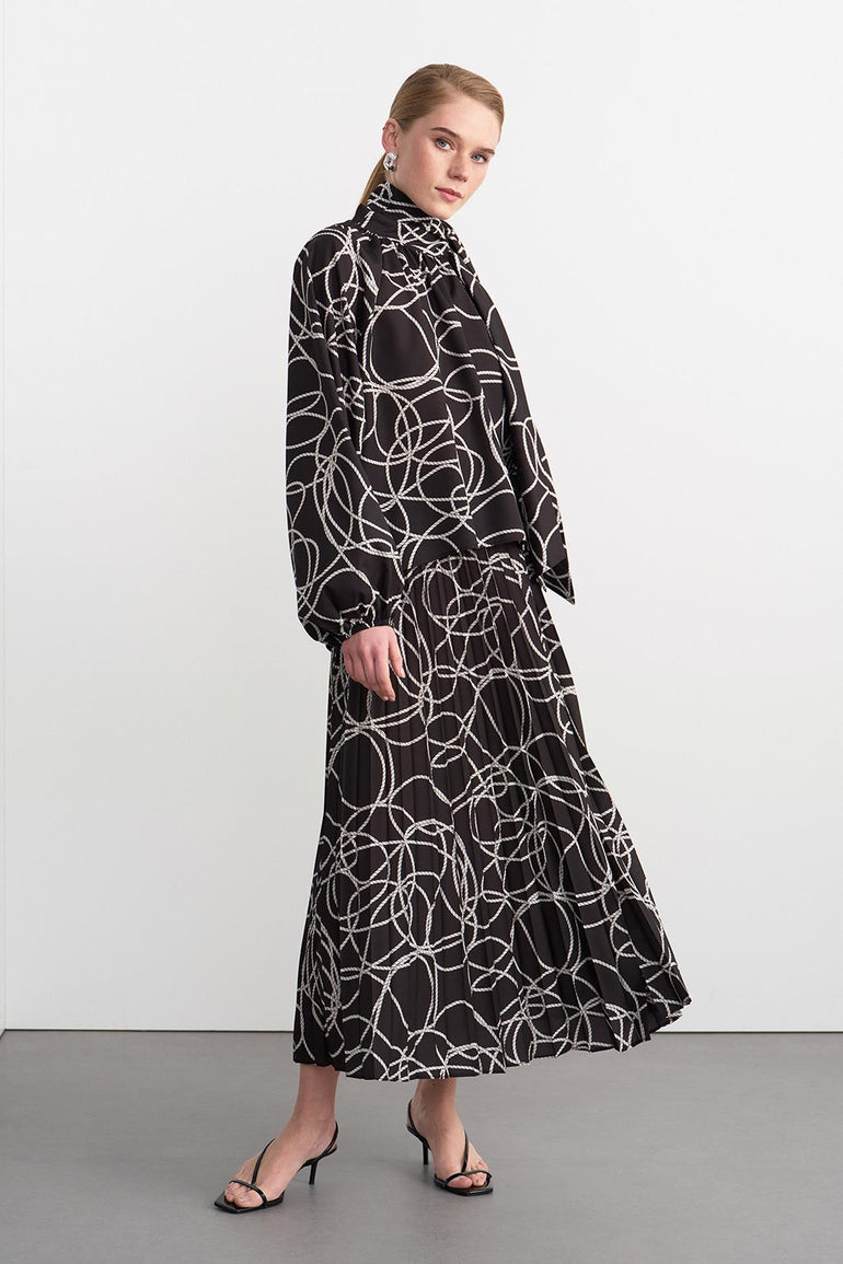 The Rope-Patterned Two Piece Set combines soft crepe fabric with meticulously crafted patterns, offering both elegance and practicality. The scarf collar detail and pleated skirt create a graceful ensemble that highlights your style. You can wear the shirt separately with jeans for a casual chic look, or pair the skirt with a classic blouse for a modern appearance.