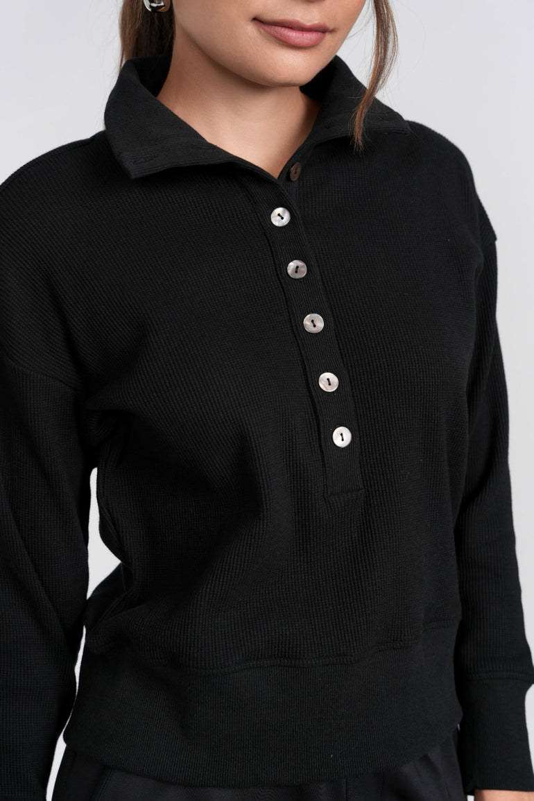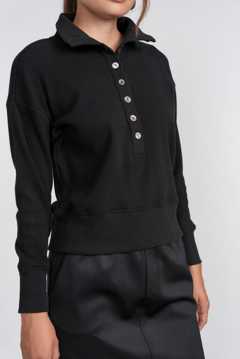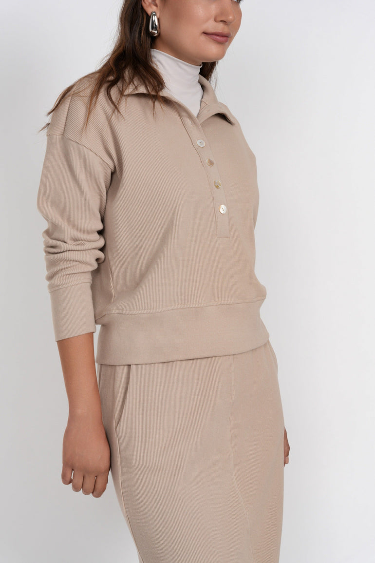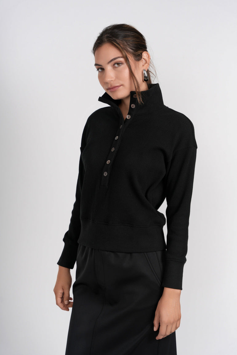 - The Sandy Top is a refined take on a classic Henley, crafted from a soft waffle-knit fabric that offers texture and comfort in equal measure.
