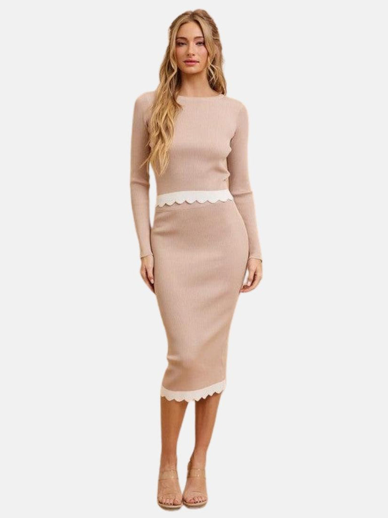 Expertly crafted, this Scallop Knit Set features a Colorblock design with long sleeves and a midi skirt that boasts a unique and stylish hem. Perfect for any occasion, this set exudes sophistication with its impeccable design and attention to detail.