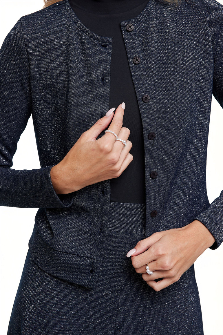 The Shimmer Embellished Cardigan combines subtle sparkle with timeless elegance. Crafted from a luxurious blend of fabrics, this cardigan features a delicate shimmer throughout, perfect for adding a touch of sophistication to any outfit. The front is detailed with beautifully crafted buttons, designed to complement the cardigan’s shimmering fabric. Available in Black Shimmer and Navy Shimmer, this piece is ideal for layering over dresses or pairing with skirts for a polished and refined look.