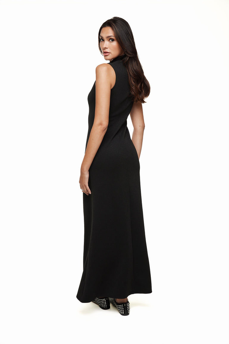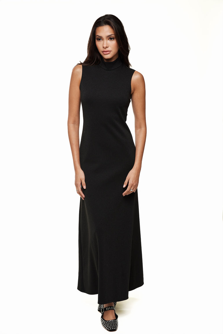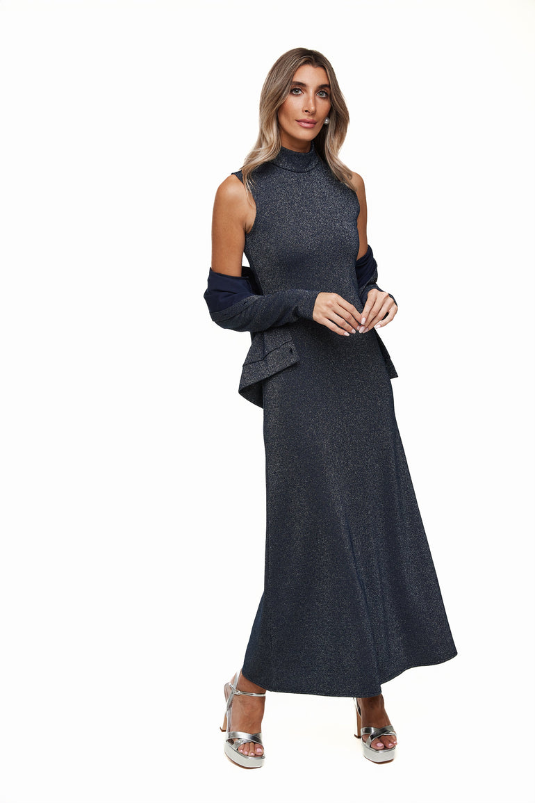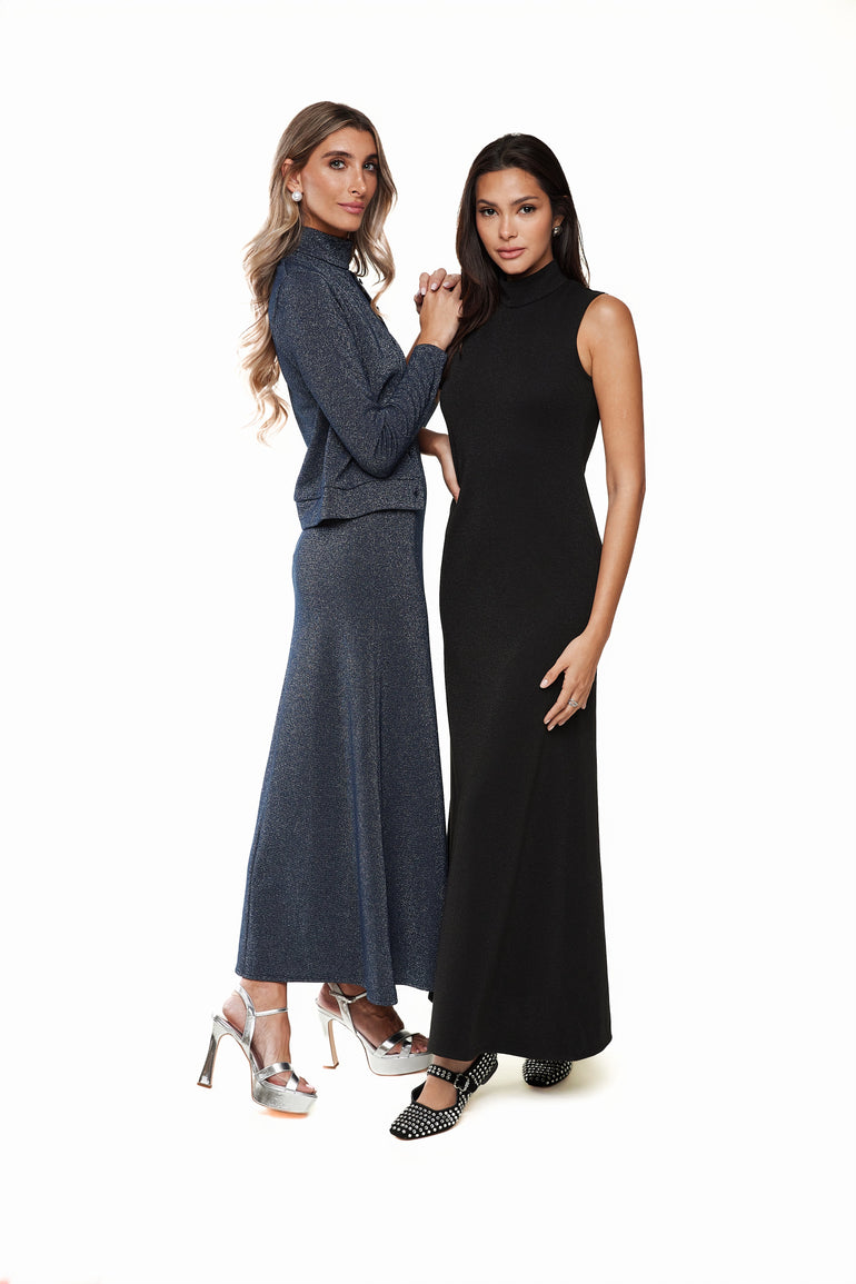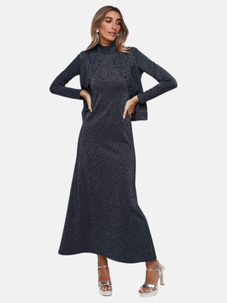The Shimmer Embellished Mock Neck Dress effortlessly blends elegance with versatility. Crafted from the same luxurious fabric as our Shimmer Embellished Cardigan and Maxi Skirt, this dress features a subtle shimmer that adds a touch of glamour to any occasion. The mock neck design offers a sleek, modern silhouette. Wear this dress sleeveless for a chic look or add a touch of modesty by layering it with our Olivvi basic top or the Embellished Cardigan. This dress is perfect for creating a coordinated, sophisticated ensemble.