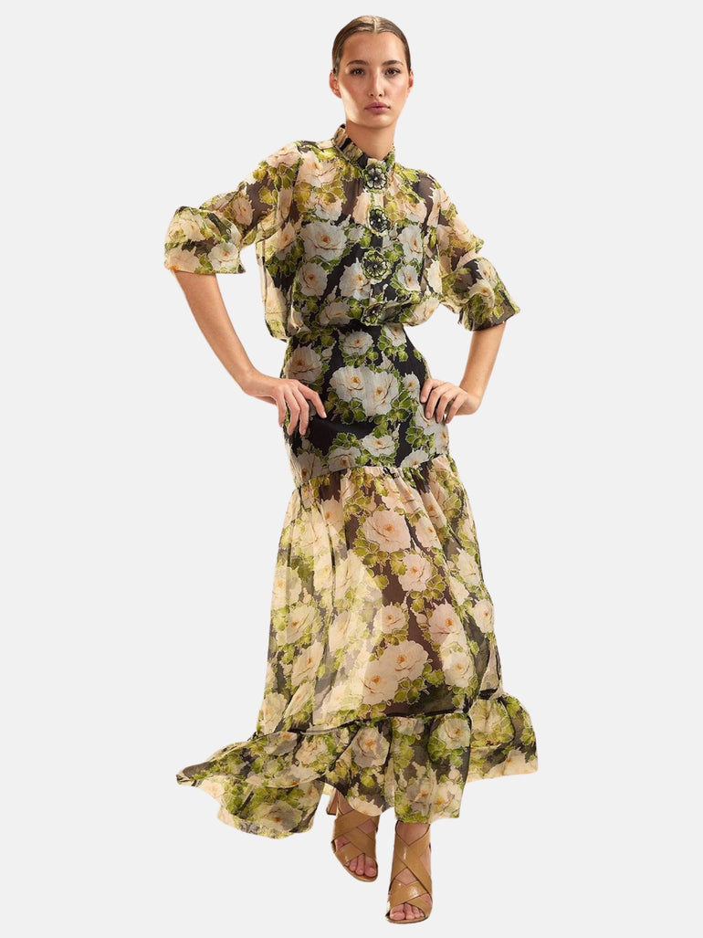 Silk organza for all summer long. This maxi skirt has a fitted waist and tiered bottom ruffle that brings movement and sheer delight to every step.