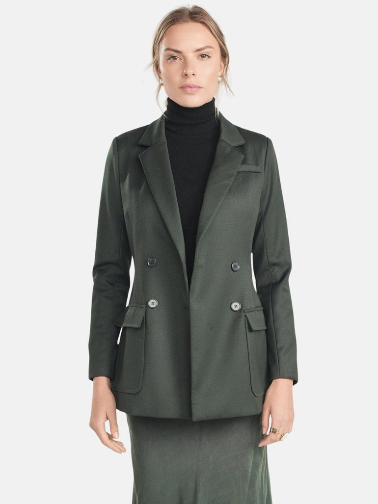 The Tailored Wool Blazer is a refined essential crafted in a deep hunter green hue. With a structured yet feminine silhouette, this double-breasted blazer features sharp lapels, flap pockets, and a tailored fit that layers effortlessly over dresses or skirts. The wool blend adds warmth without bulk, making it a versatile wardrobe staple for cooler months.