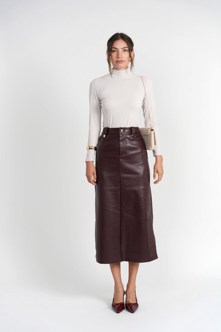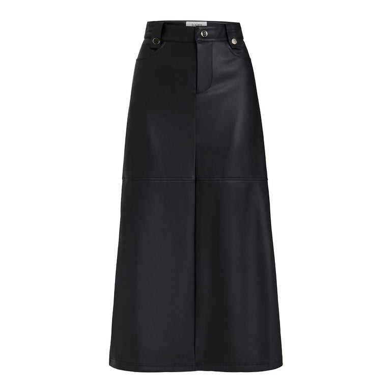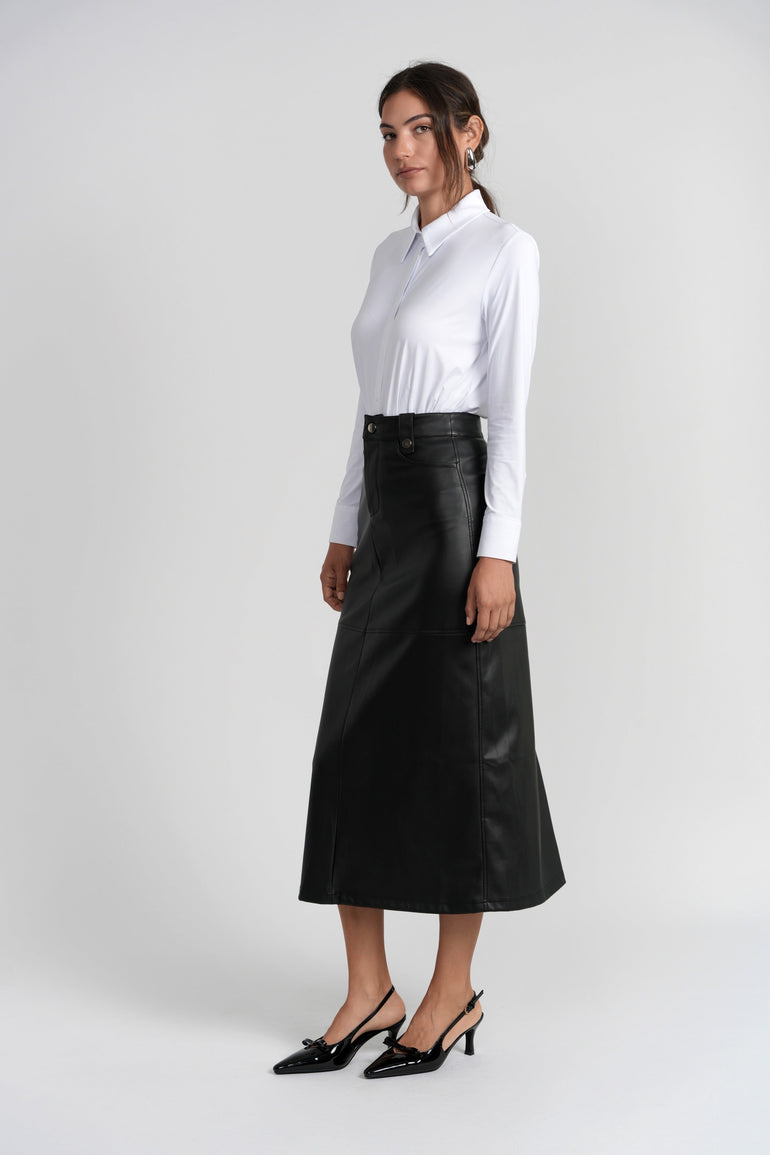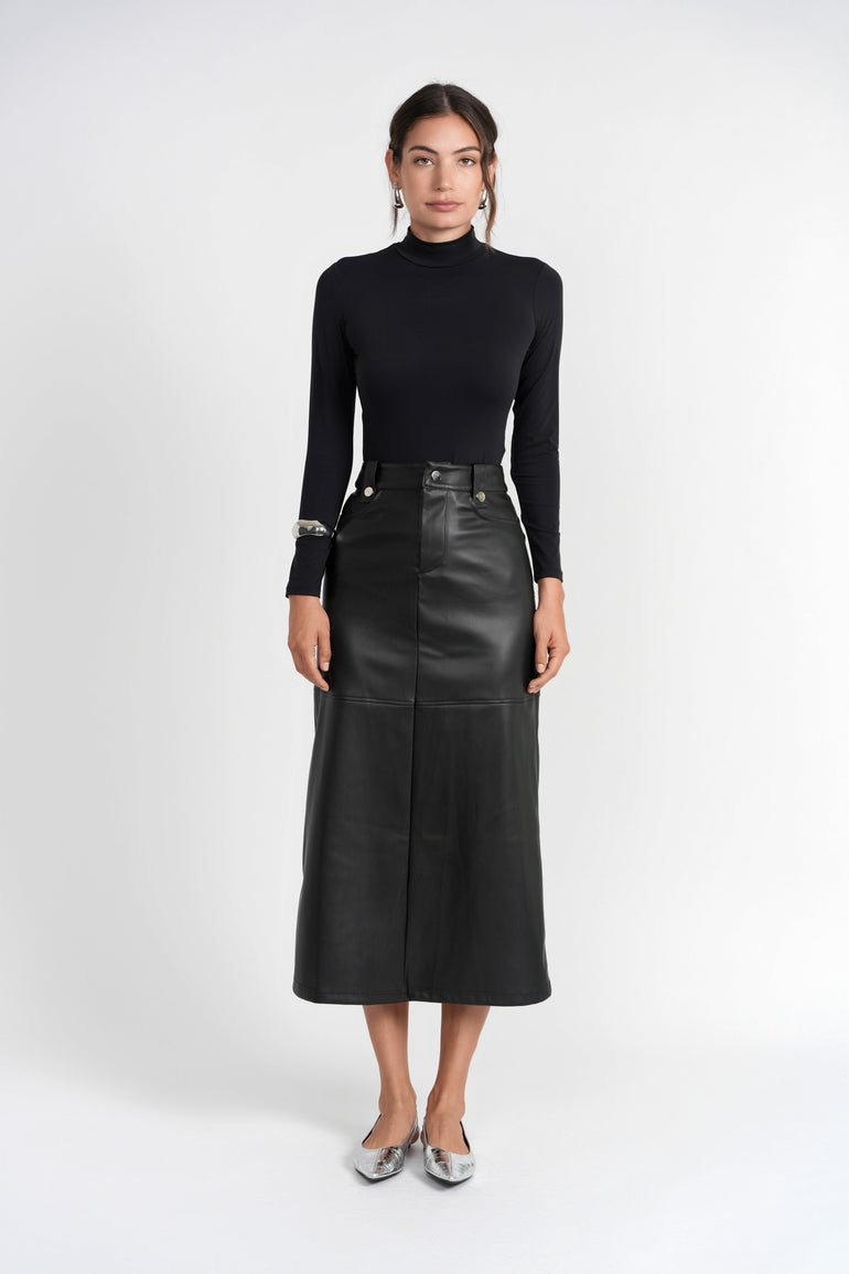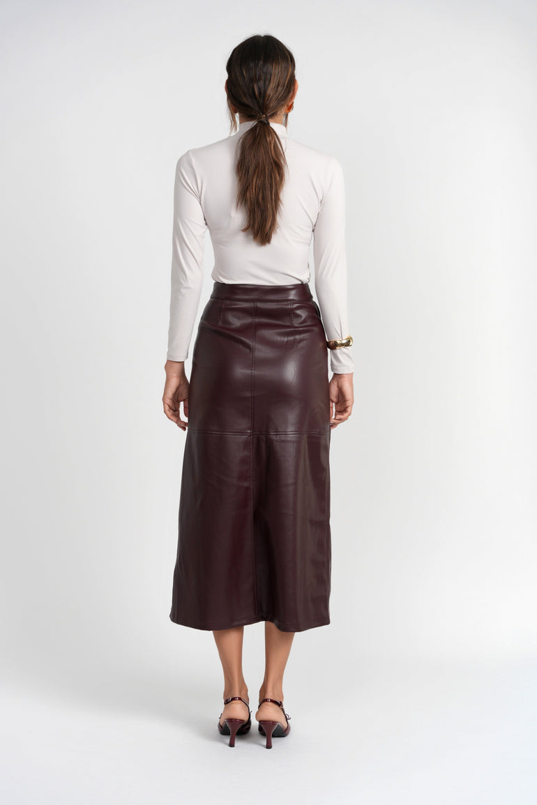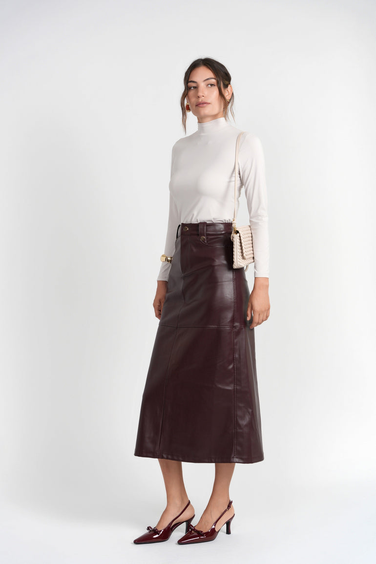 - The Tanya Skirt is a modern A-line silhouette, expertly crafted in supple vegan leather with a clean, structured finish.