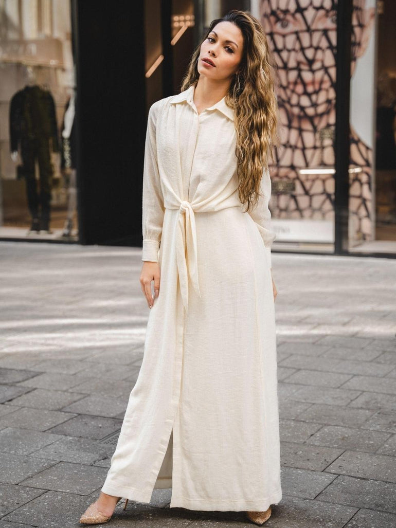 Veronica a gauze looking fabric button down maxi dress with collar.The tie made at the waist can be tied tighter or looser to accentuate the waist .The cream color is fully lined.