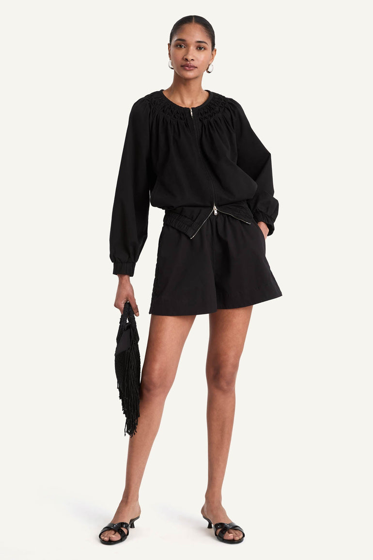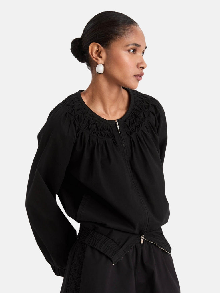 The CORLETT Jacket delivers a fresh spin on the classic bomber silhouette, combining a utilitarian twill fabrication with elegant detailing. Crafted from a soft yet durable cotton-spandex blend, the versatile full-length jacket features a striking hand-smocked neckline that lends a textural focal point. Long sleeves and a two-way metal zipper offer ease of movement while elasticated cuffs and a waistband provide a comfortable, secure fit. The piece is fully lined in luxurious cupro satin and includes handy pockets for a touch of practicality. A unique yet timeless layer, this CORLETT Jacket effortlessly transitions from casual to elevated ensembles when paired with leggings, denim, or matching shorts.