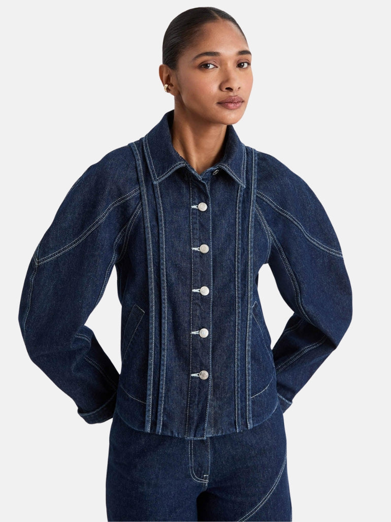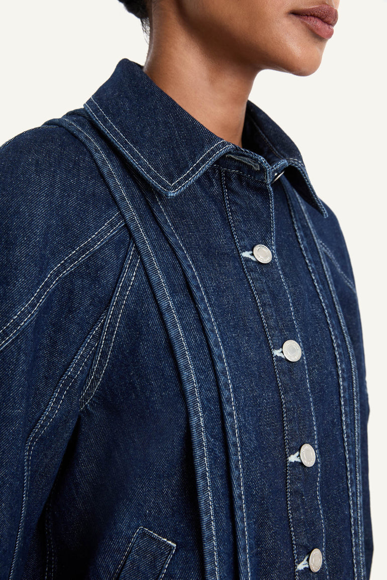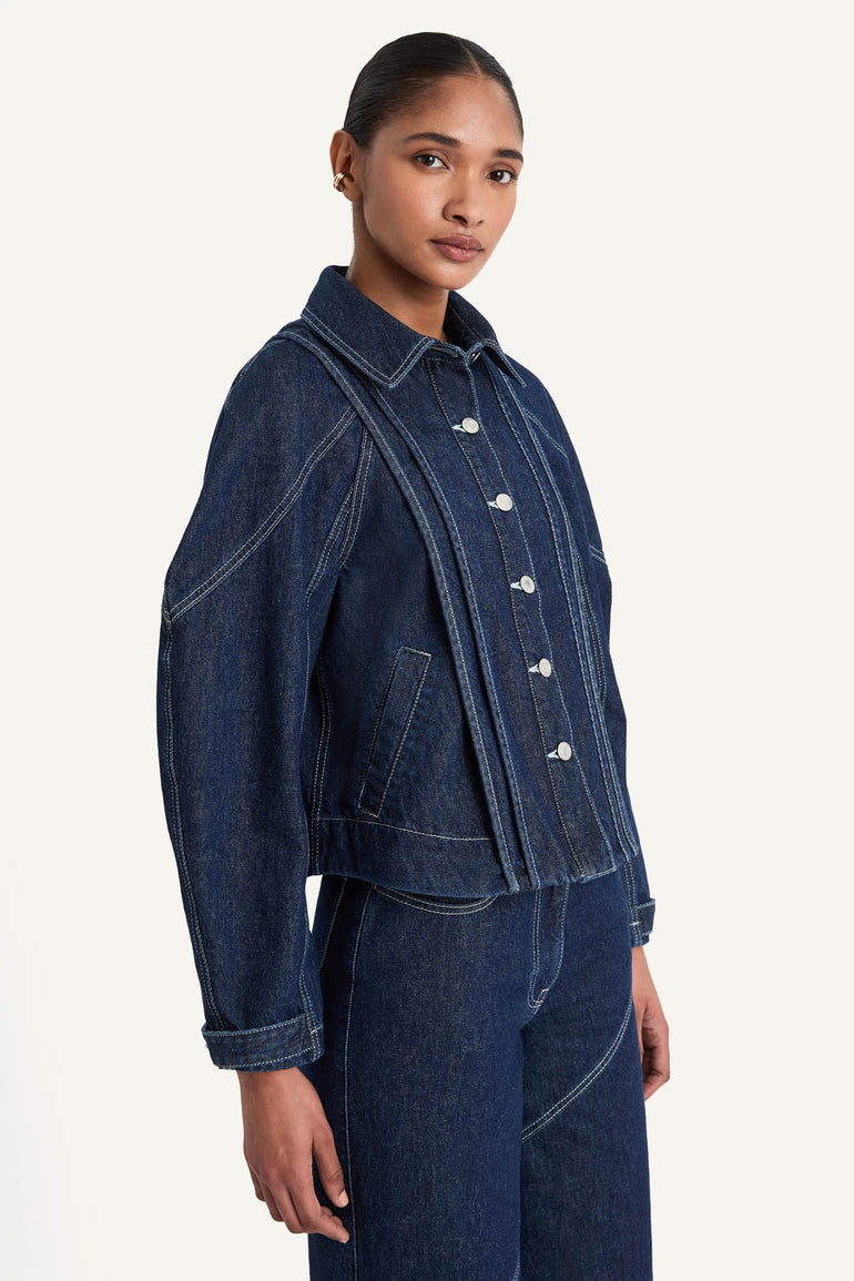 Exquisitely fashioned from 100% GOTS-certified cotton denim, the FOLSOM Jacket epitomizes contemporary sophistication. Its unique cocoon silhouette boasts a cropped length and an intricately layered bodice, while angled seams along the sleeves lend an architectural flair. Adjustable button tabs at the cuffs allow for a personalized fit. Style this versatile piece alongside the TRUXTON Jean.